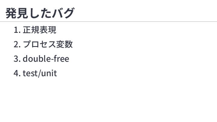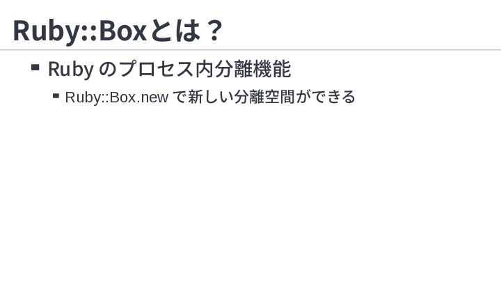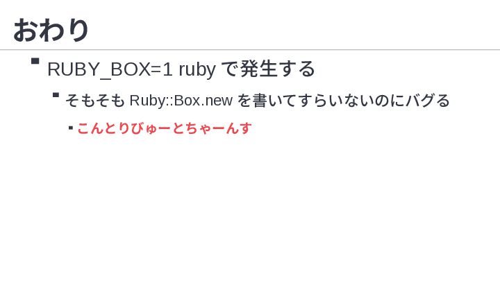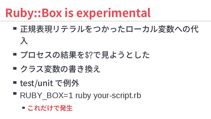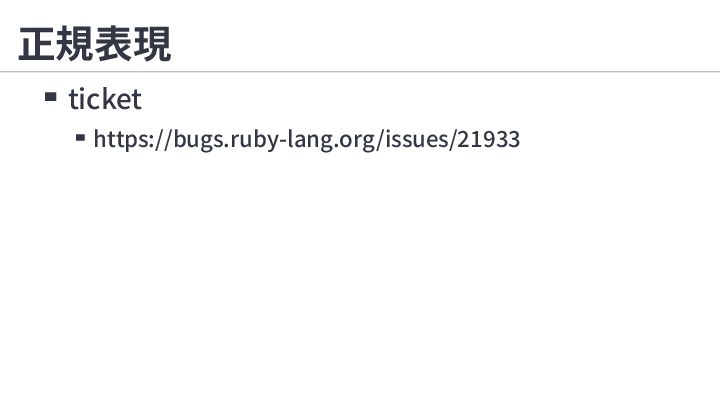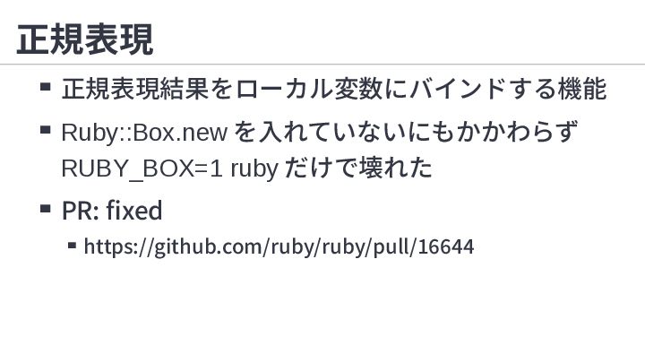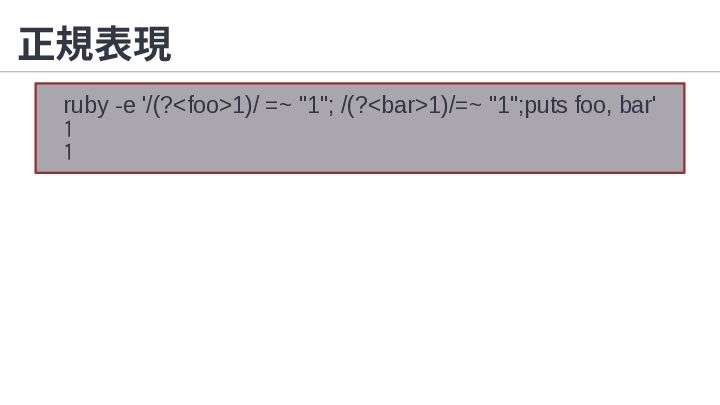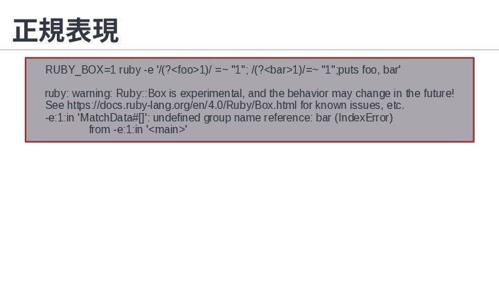 1. 正規表現 RUBY_BOX=1 ruby -e '/(?<foo>1)/ =~ "1"; /(?<bar>1)/=~ "1";puts foo,
