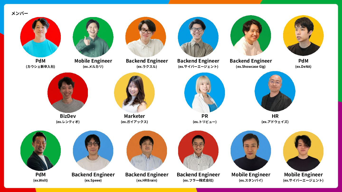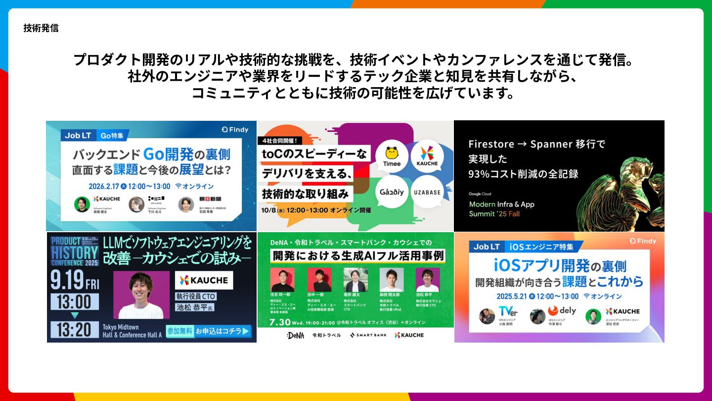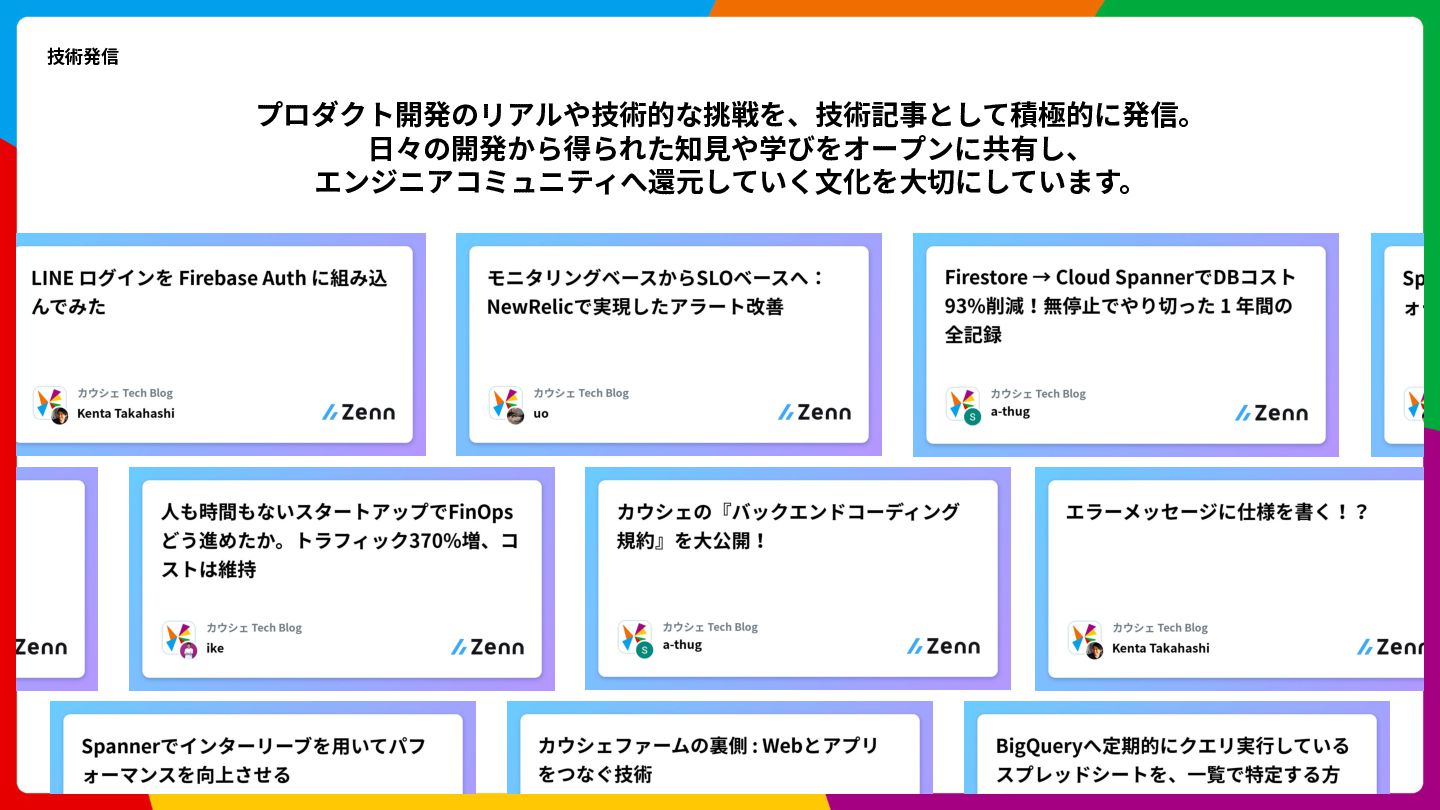 Cloud Scheduler Cloud Spanner Cloud Storage Trace Cloud Load Balancing 開発⾔語 Go, Swift, Kotlin, Typescript アーキテクチャ Clean Architecture, MVVM フレームワーク gRPC, SwiftUI, Jetpack Compose インフラ Google Cloud (Cloud Run, Spanner, Pub/Sub, etc) 構成管理 Terraform データ / ML BigQuery, Dataform, Vertex AI Observability Newrelic, Cloud Monitoring, Cloud Logging, Cloud Trace CI/CD GitHub Actions, Bitrise, Cloud Build 開発ツール GitHub, Slack, Notion デザイン Figma LLM ChatGPT, Claude Code, Claude Code Action, Cline, Codex, Cursor, etc