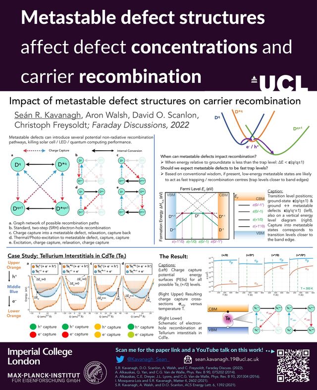 Faraday Discussions, 2022 Impact of metastable defect structures on carrier recombination Scan me for the paper link and a YouTube talk on this work! Metastable defect structures affect defect concentrations and carrier recombination a. Graph network of possible recombination paths b. Standard, two-step (SRH) electron-hole recombination c. Charge capture into a metastable defect, relaxation, capture back d. Thermal/Photo-excitation to metastable defect, capture, capture e. Excitation, charge capture, relaxation, charge capture e- / h+ Dq D*q Dq±1 Metastable defects can introduce several potential non-radiative recombination pathways, killing solar cell / LED / quantum computing performance. When can metastable defects impact recombination? Ø When energy relative to groundstate is less than the trap level: ∆E < ε(q/q±1) Should we expect metastable defects to be fast trap levels? Ø Based on conventional wisdom, if present, low-energy metastable states are likely to act as fast trapping / recombination centres (trap levels closer to band edges) Caption: Transition level positions; ground-state ε(q/q±1) & ground ↔ metastable defects ε(q/q∗±1) (left), also on a vertical energy level diagram (right). Capture into metastable states corresponds to transition levels closer to the band edge. Case Study: Tellurium Interstitials in CdTe (Tei ) The Result: h+ capture e– capture h+ capture e– capture h+ capture e– capture h+ capture e– capture Upper Orange Middle Blue Lower Orange e– h+ Captions: (Left) Charge capture potential energy surfaces (PESs) for all possible Tei (+/0) levels. (Right Upper) Resulting charge capture cross- sections σn/p versus temperature T. (Right Lower) Schematic of electron- hole recombination at Tellurium interstitials in CdTe. @Kavanagh_Sean_