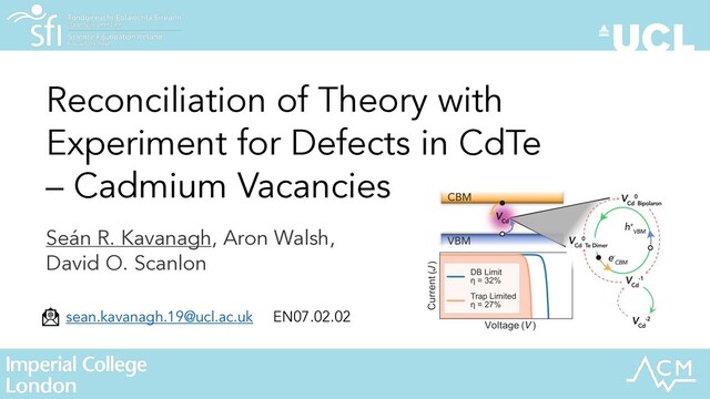 (first thin-film absorber to be commercialised). • Carrier recombination reduces efficiencies from the detailed-balance limit of 32%, to a current record of 22%.1 • VCd known to be an important acceptor species, affecting both conductivity and electron-hole recombination. • Despite >70 years of research, atomistic mechanisms have remained unclear. 1 Best Research-Cell Efficiency Chart — Photovoltaic Research — NREL. www.nrel.gov/pv/cell-efficiency