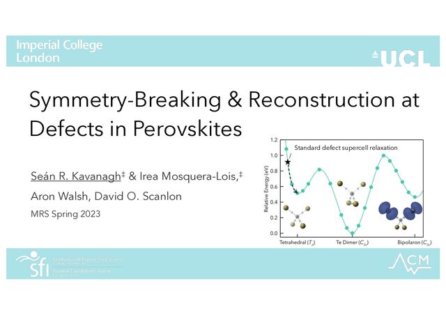 Slides for my talk 'Symmetry-Breaking & Reconstruction at Defects in Perovskites' at MRS Spring 2023, San Francisco – discussing the issue of global optimisation for defects in solids, its particular relevance & importance for perovskites, and our work (ShakeNBreak) on tackling this issue.