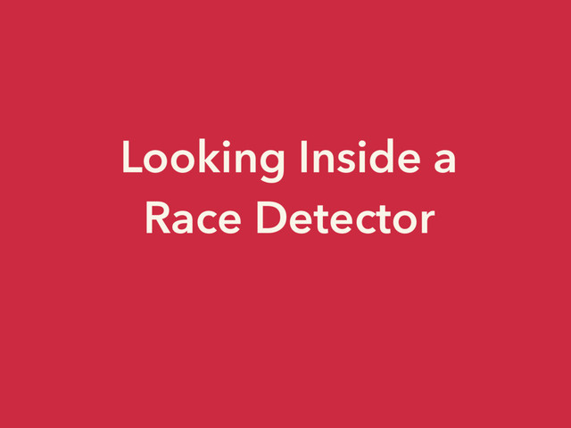 to track memory accesses. package sync import “internal/race" func (m *Mutex) Lock() { if race.Enabled { race.Acquire(…) } ... } raceacquire(addr) mutex.go package runtime func newproc1() { if race.Enabled { newg.racectx = racegostart(…) } ... } proc.go What about synchronization events, and goroutine creation?