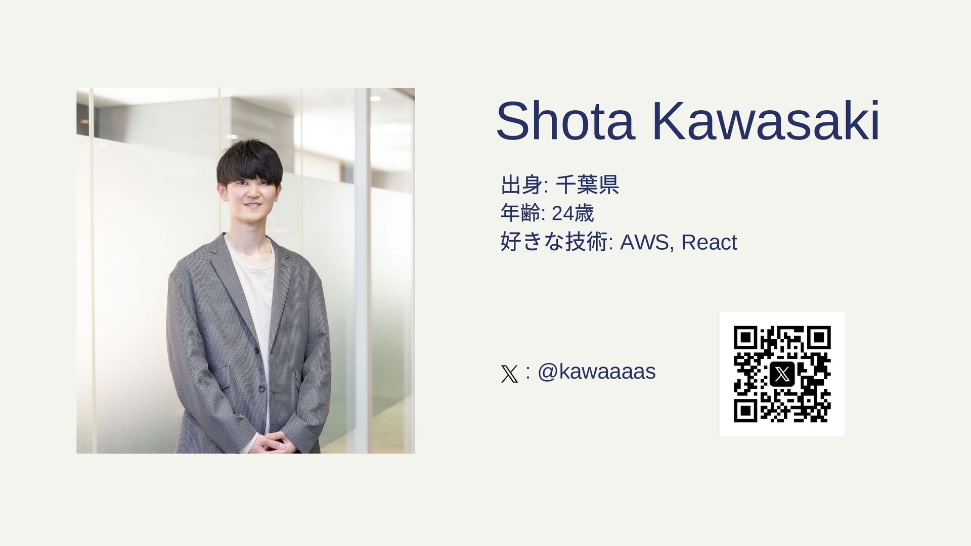 出身: 千葉県 年齢: 24 歳 好きな技術: AWS, React Shota Kawasaki