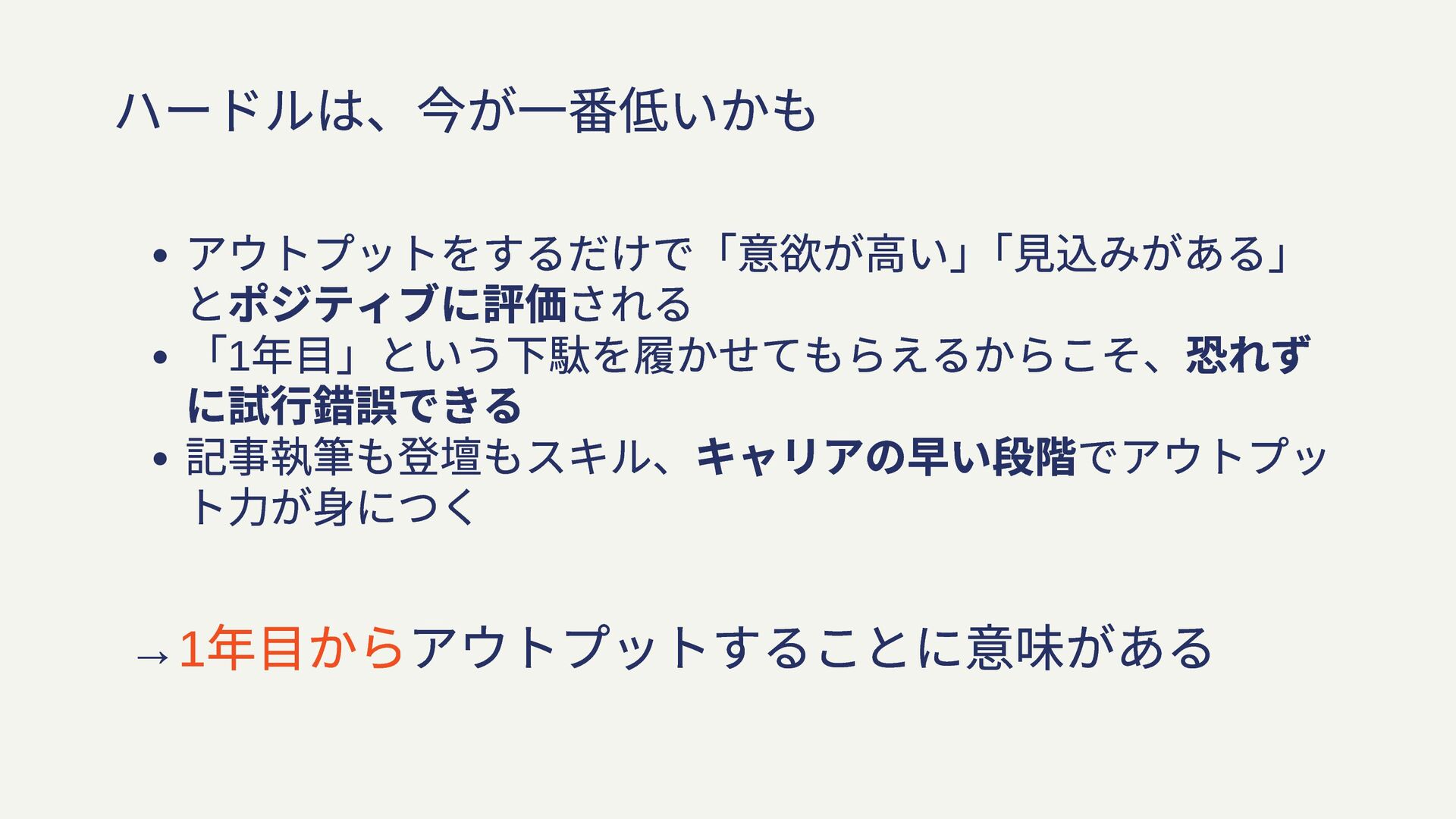 ハードルは、今が一番低いかも アウトプットをするだけで「意欲が高い」 「見込みがある」 とポジティブに評価される 「1 年目」という下駄を履かせてもらえるからこそ、恐れず に試行錯誤できる 記事執筆も登壇もスキル、キャリアの早い段階でアウトプッ ト力が身につく →1