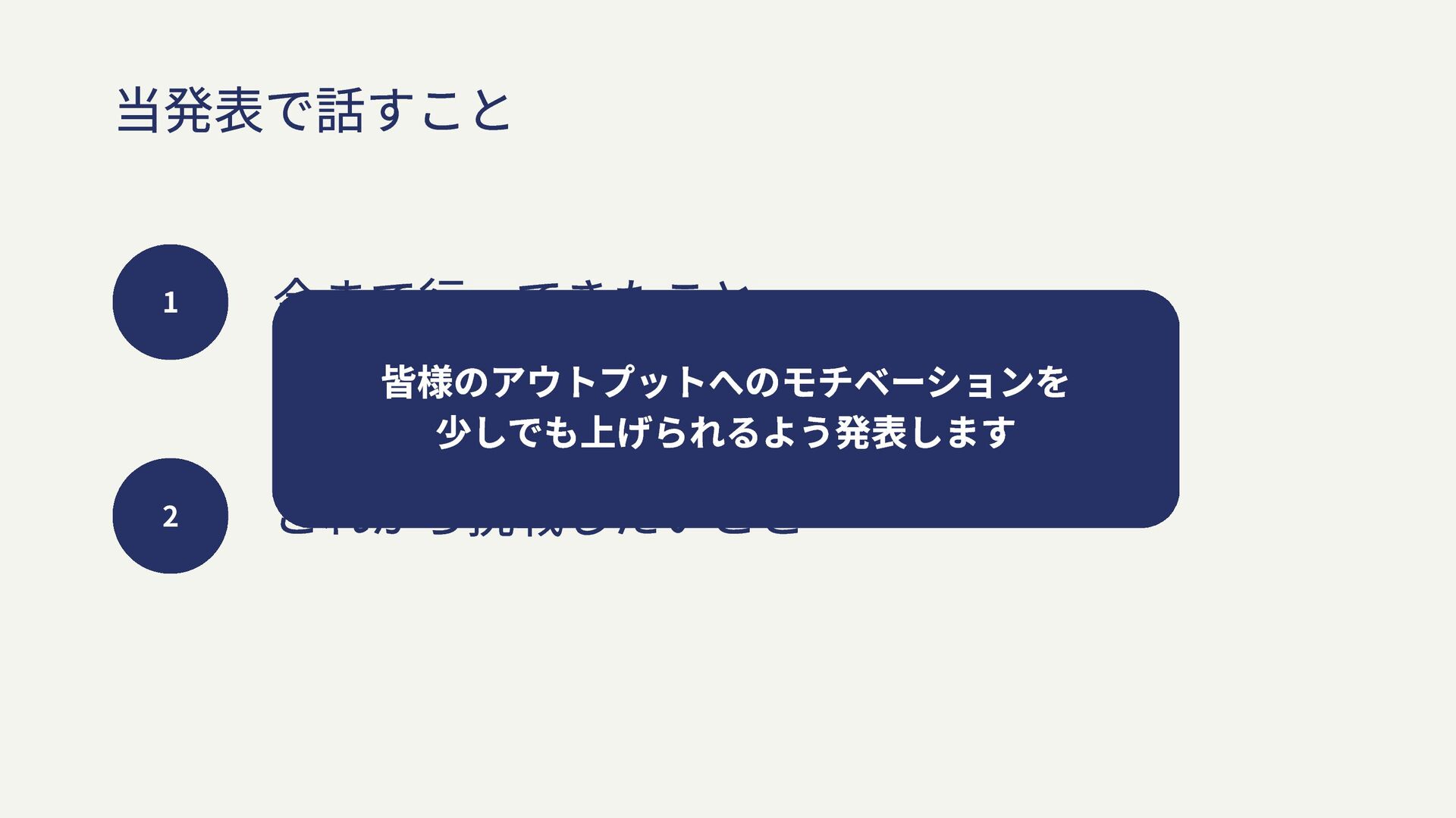 当発表で話すこと 1 今まで行ってきたこと 2 これから挑戦したいこと 皆様のアウトプットへのモチベーションを 少しでも上げられるよう発表します