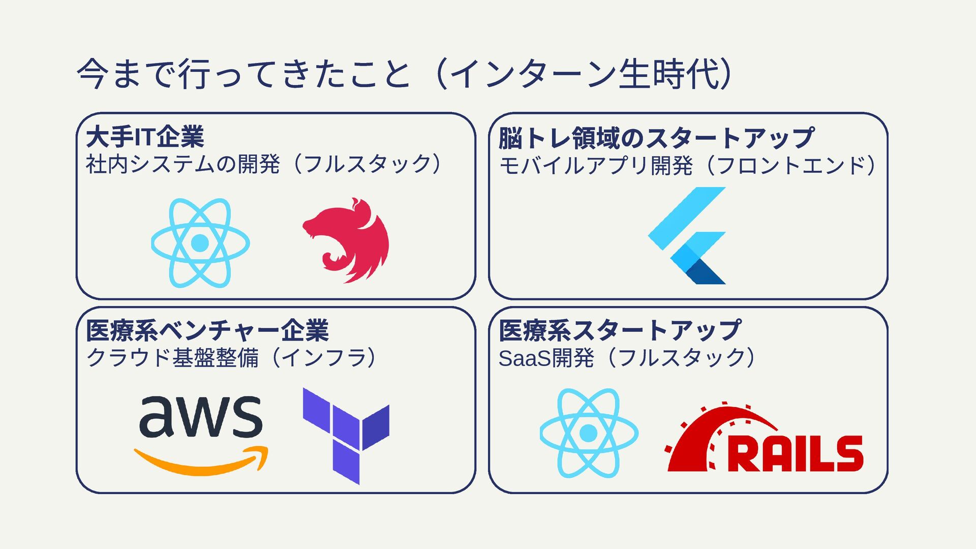 今まで行ってきたこと(インターン生時代) 大手IT 企業 社内システムの開発(フルスタック) 脳トレ領域のスタートアップ モバイルアプリ開発(フロントエンド) 医療系ベンチャー企業 クラウド基盤整備(インフラ) 医療系スタートアップ SaaS