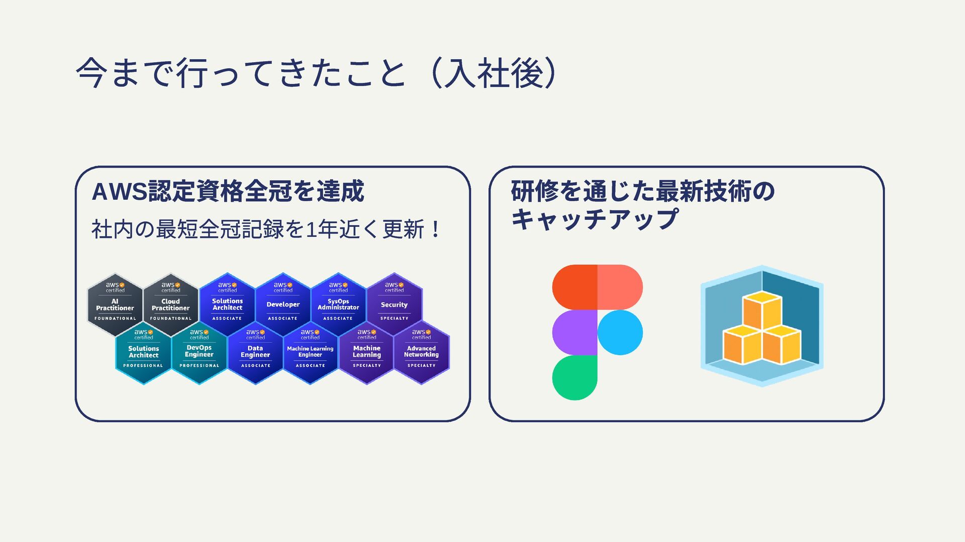 今まで行ってきたこと(入社後) AWS 認定資格全冠を達成 社内の最短全冠記録を1 年近く更新! 研修を通じた最新技術の キャッチアップ