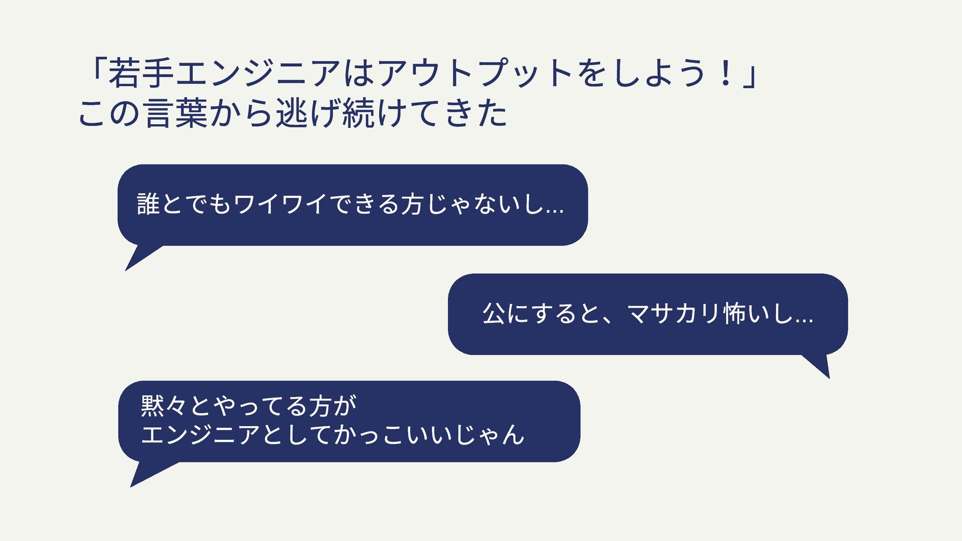 「若手エンジニアはアウトプットをしよう!」 この言葉から逃げ続けてきた 誰とでもワイワイできる方じゃないし... 黙々とやってる方が エンジニアとしてかっこいいじゃん 公にすると、マサカリ怖いし...