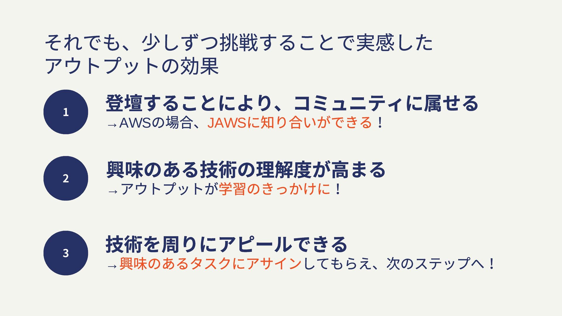 それでも、少しずつ挑戦することで実感した アウトプットの効果 1 登壇することにより、コミュニティに属せる →AWS の場合、JAWS に知り合いができる! 2 3 興味のある技術の理解度が高まる