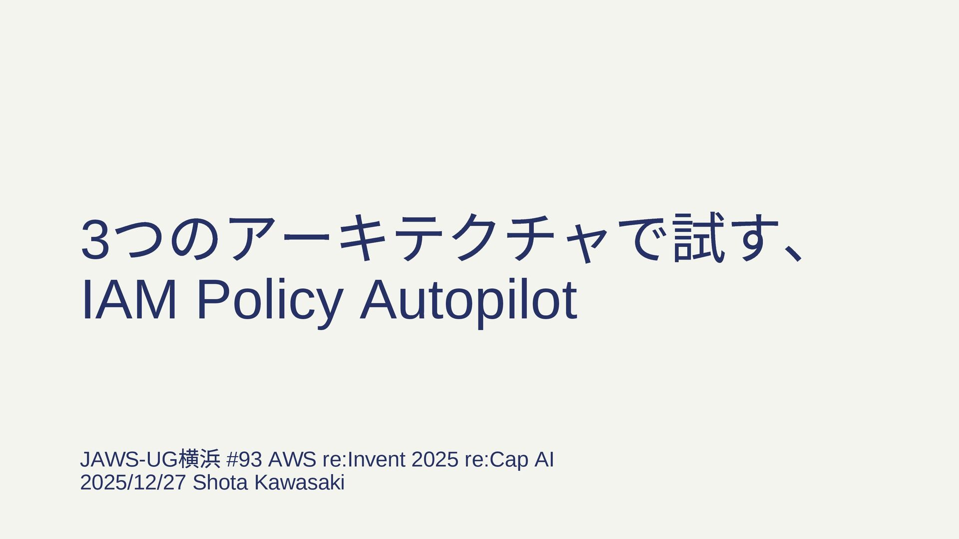 3 つのアーキテクチャで試す、 IAM Policy Autopilot JAWS-UG 横浜 #93 AWS re:Invent