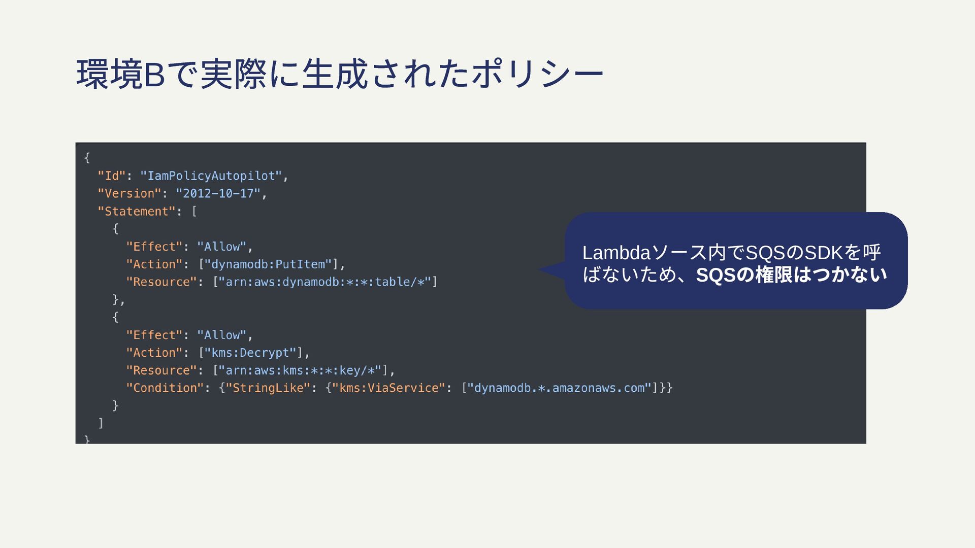 環境B で実際に生成されたポリシー Lambda ソース内でSQS のSDK を呼 ばないため、SQS の権限はつかない