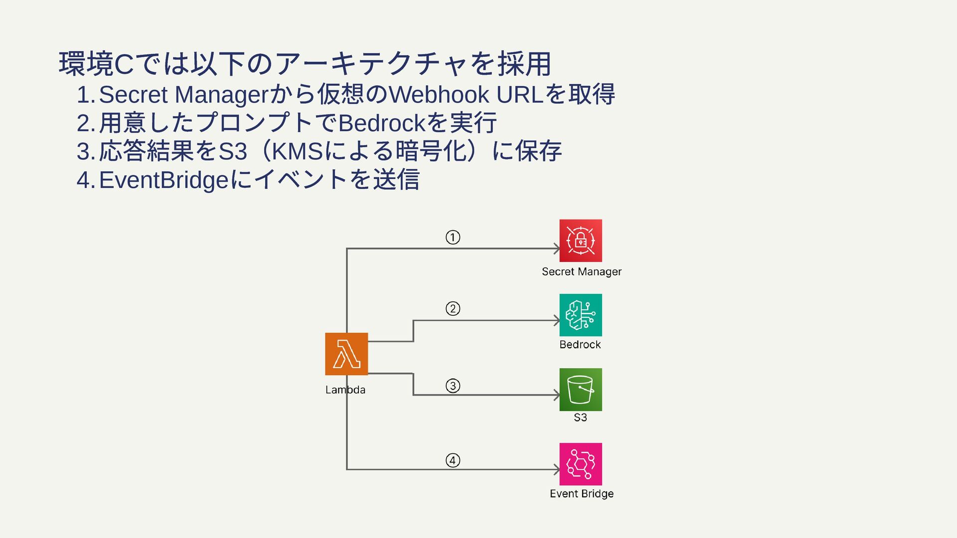 環境C では以下のアーキテクチャを採用 1.Secret Manager から仮想のWebhook URL を取得 2. 用意したプロンプトでBedrock を実行