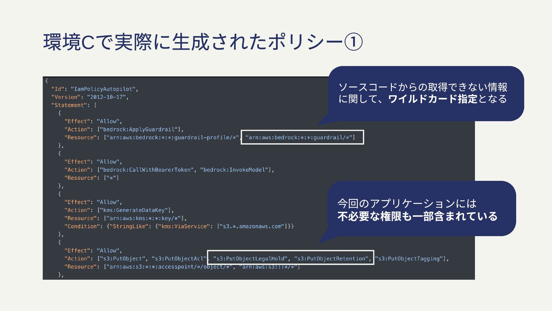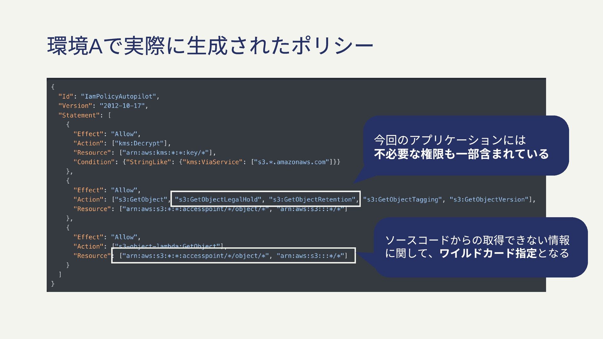 環境A で実際に生成されたポリシー 今回のアプリケーションには 不必要な権限も一部含まれている ソースコードからの取得できない情報 に関して、ワイルドカード指定となる