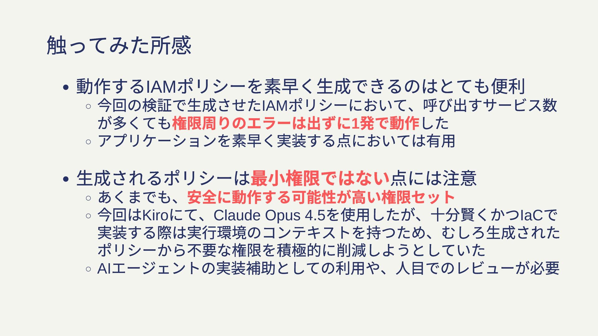 今回はKiro にて、Claude Opus 4.5 を使用したが、十分賢くかつIaC で 実装する際は実行環境のコンテキストを持つため、むしろ生成された ポリシーから不要な権限を積極的に削減しようとしていた AI エージェントの実装補助としての利用や、人目でのレビューが必要