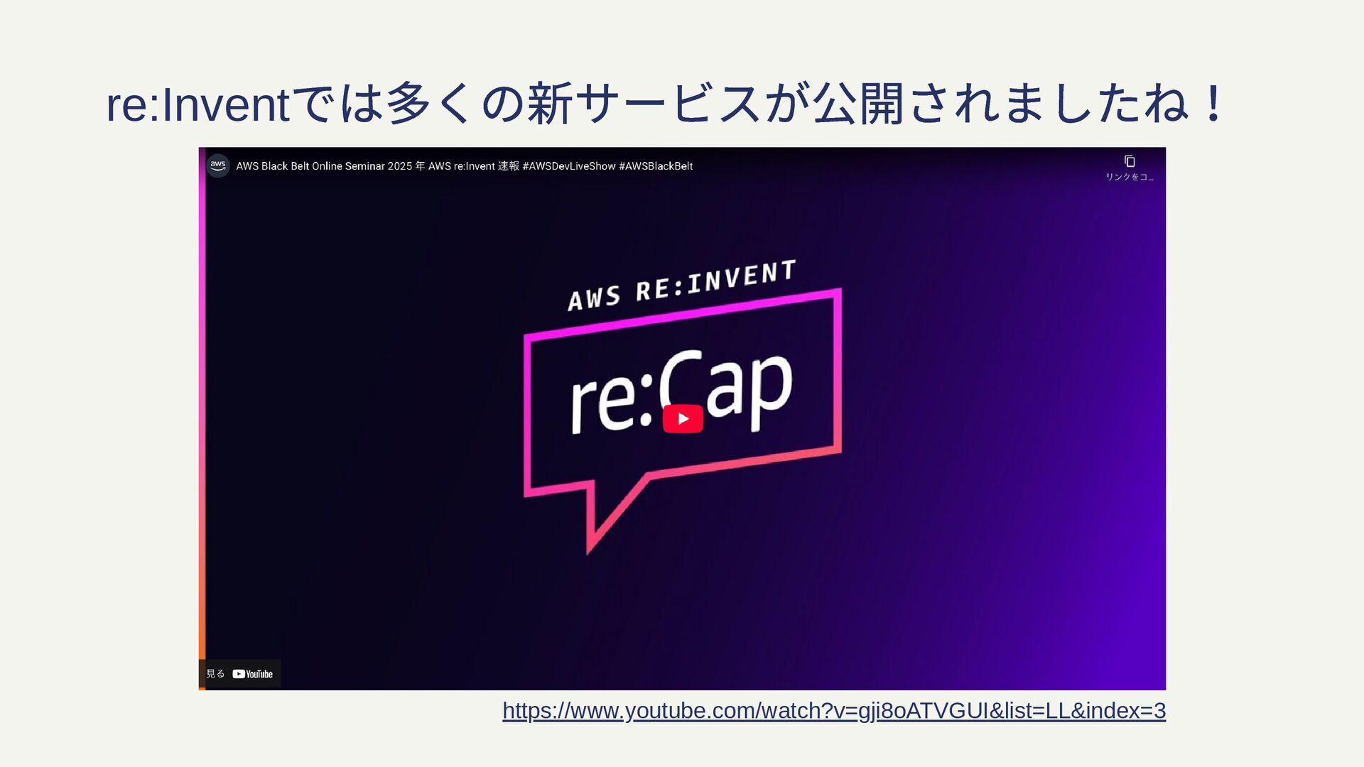 re:Invent では多くの新サービスが公開されましたね! https://www.youtube.com/watch?v=gji8oATVGUI&list=LL&index=3