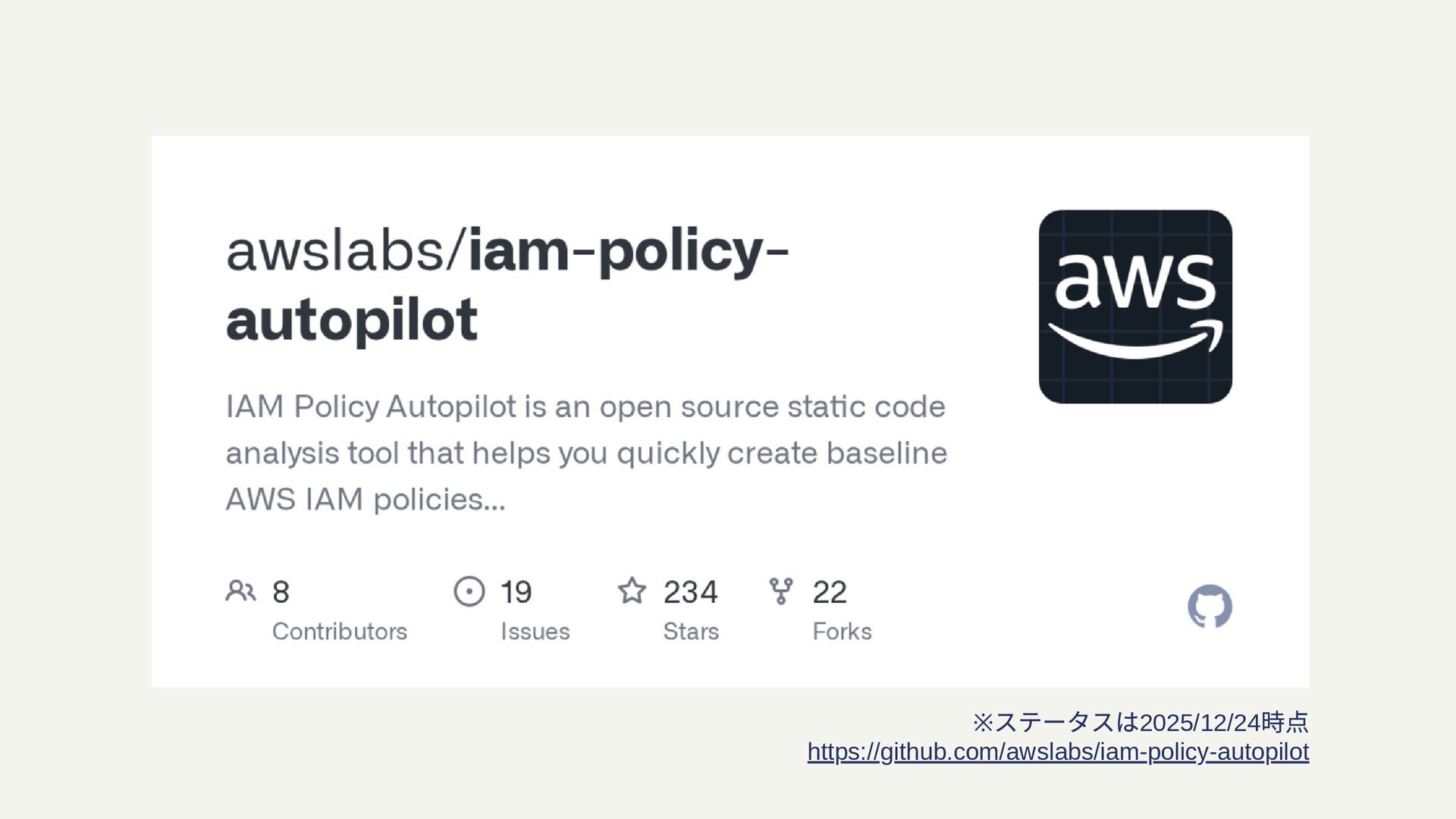 https://github.com/awslabs/iam-policy-autopilot ※ ステータスは2025/12/24 時点