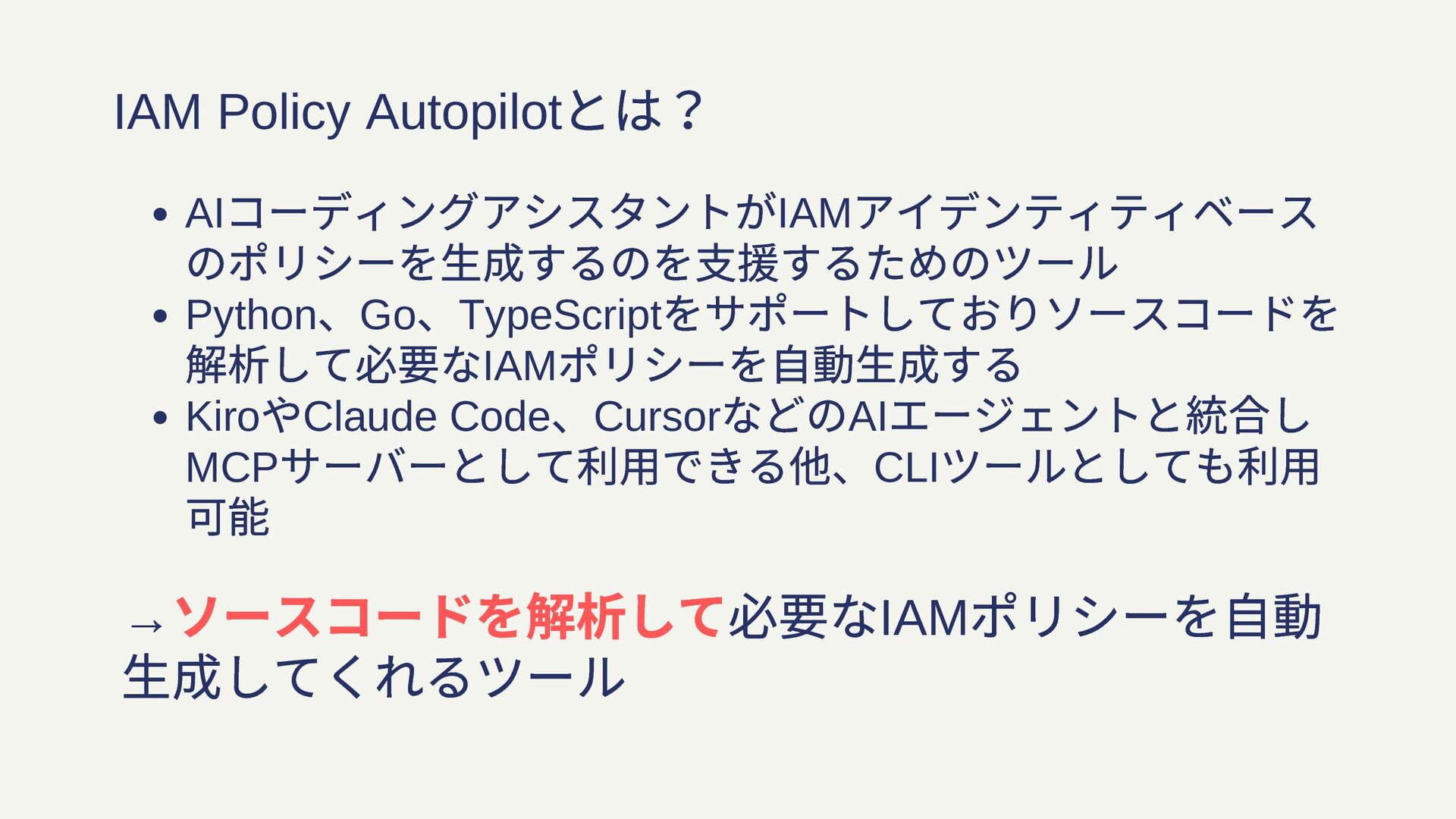 、TypeScript をサポートしておりソースコードを 解析して必要なIAM ポリシーを自動生成する Kiro やClaude Code 、Cursor などのAI エージェントと統合し MCP サーバーとして利用できる他、CLI ツールとしても利用 可能 → ソースコードを解析して必要なIAM ポリシーを自動 生成してくれるツール