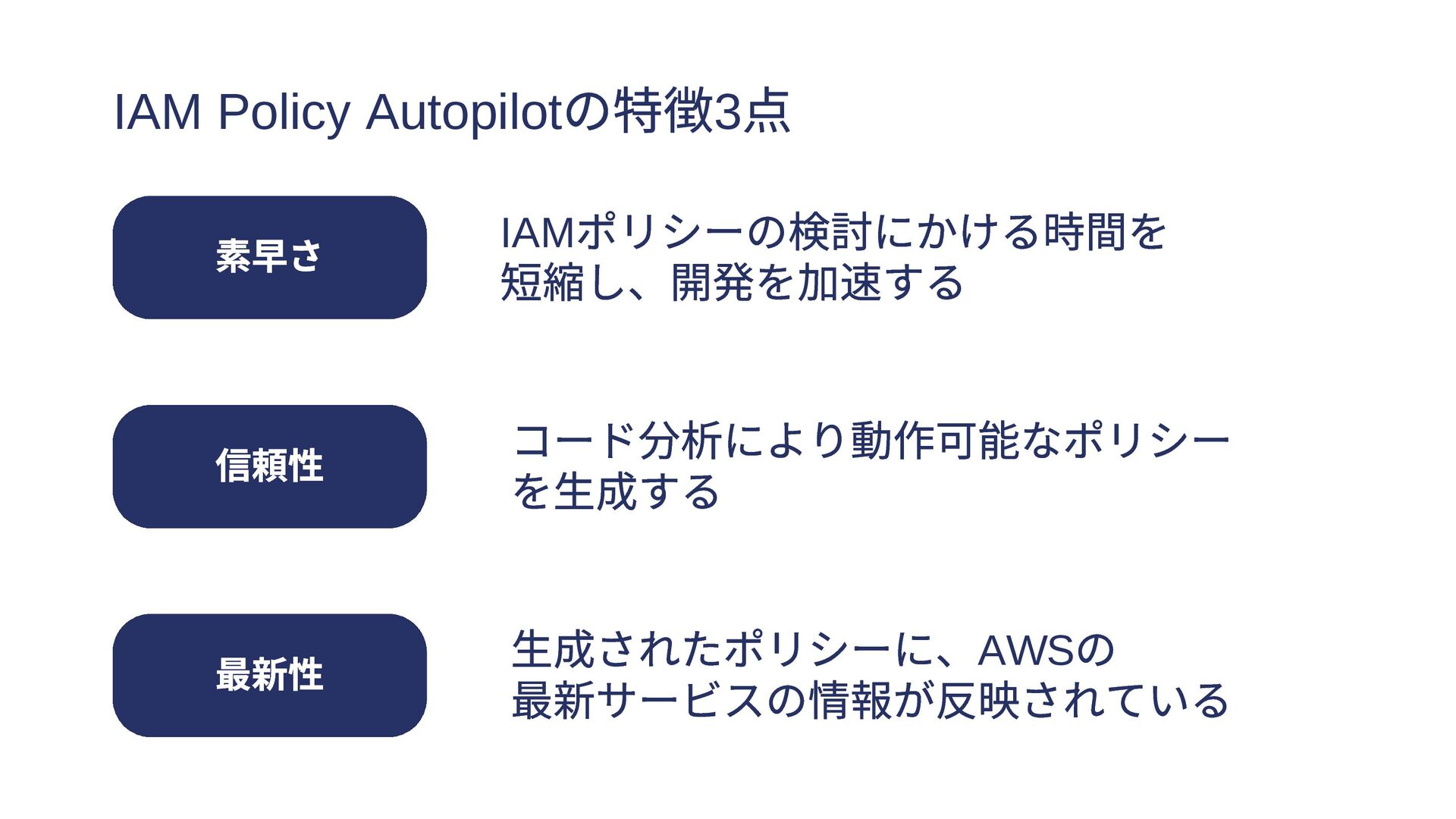 素早さ IAM Policy Autopilot の特徴3 点 IAM ポリシーの検討にかける時間を 短縮し、開発を加速する 信頼性