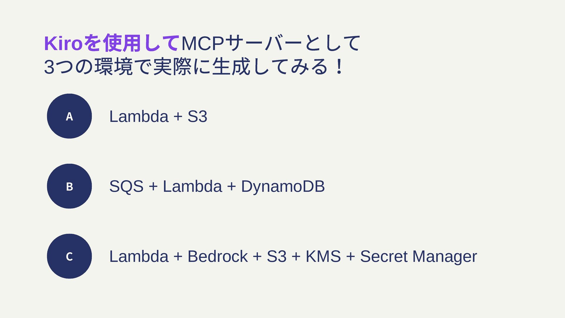 Kiro を使用してMCP サーバーとして 3 つの環境で実際に生成してみる! A Lambda + S3 B