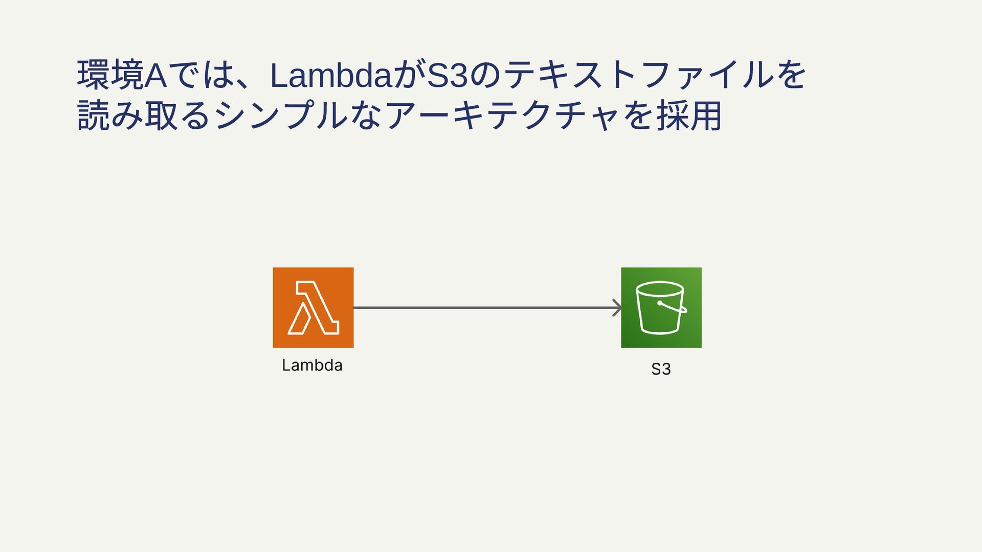 環境A では、Lambda がS3 のテキストファイルを 読み取るシンプルなアーキテクチャを採用