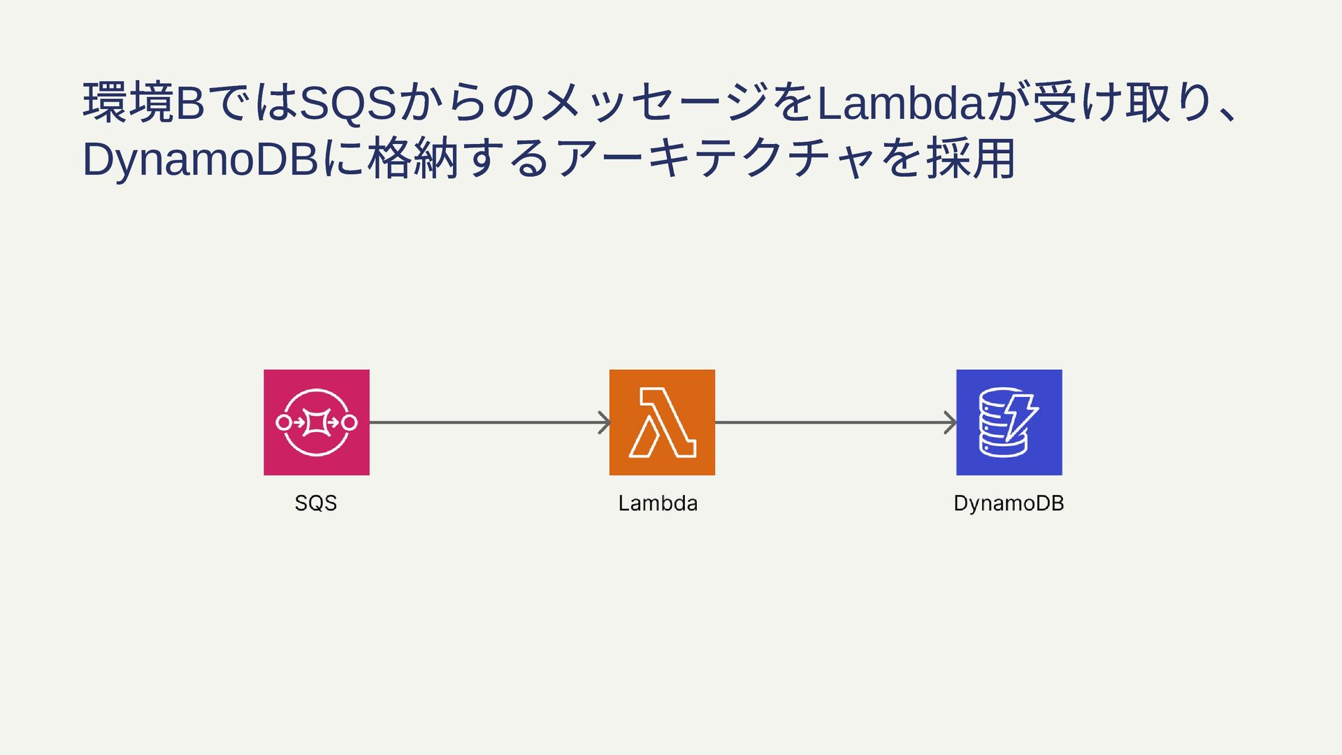 環境B ではSQS からのメッセージをLambda が受け取り、 DynamoDB に格納するアーキテクチャを採用
