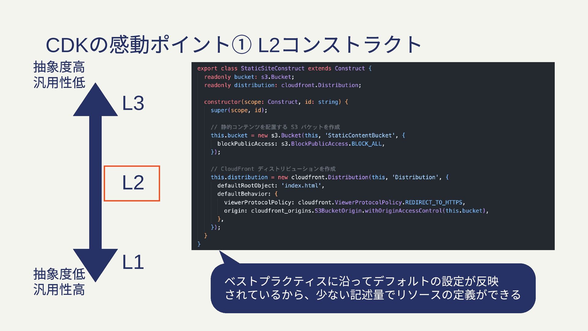 ベストプラクティスに沿ってデフォルトの設定が反映 されているから、少ない記述量でリソースの定義ができる CDK の感動ポイント① L2 コンストラクト L3 L2 L1 抽象度高