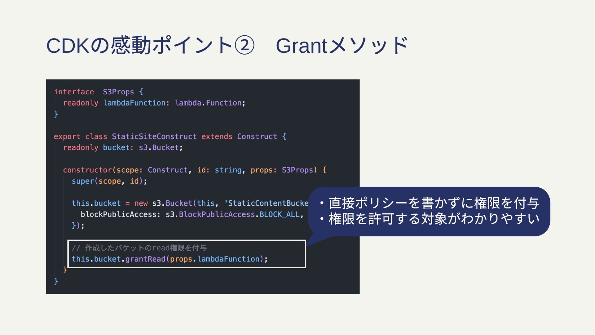 CDK の感動ポイント② Grant メソッド ・直接ポリシーを書かずに権限を付与 ・権限を許可する対象がわかりやすい