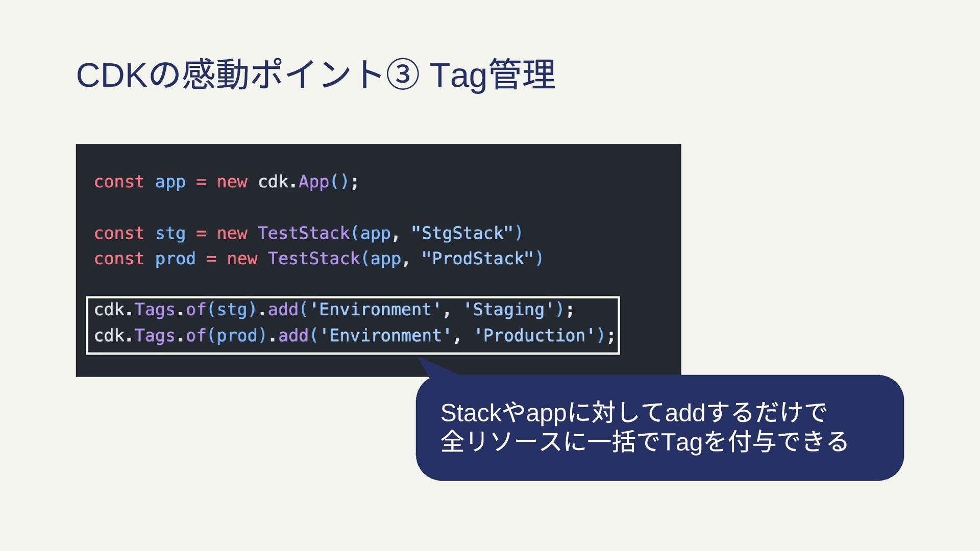 CDK の感動ポイント③ Tag 管理 Stack やapp に対してadd するだけで 全リソースに一括でTag を付与できる