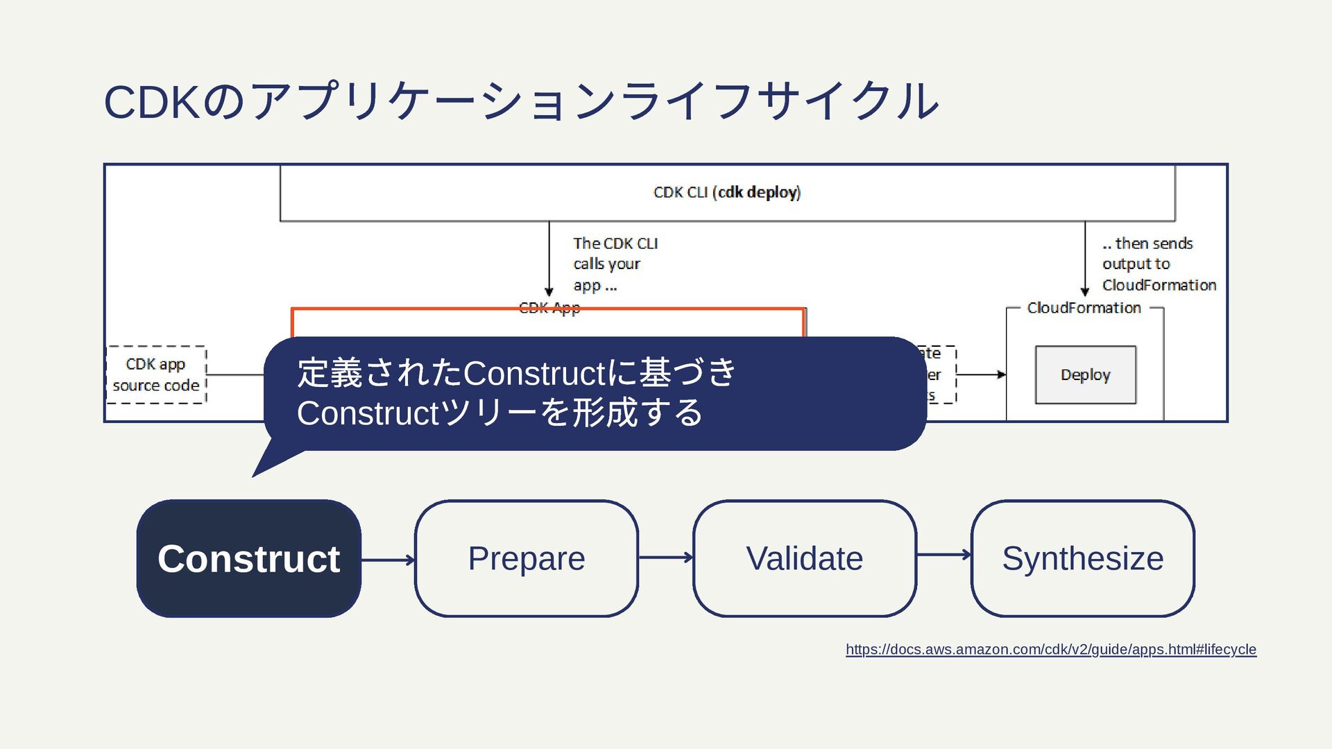 Constract Prepare Validate Synthesize CDK のアプリケーションライフサイクル https://docs.aws.amazon.com/cdk/v2/guide/apps.html#lifecycle