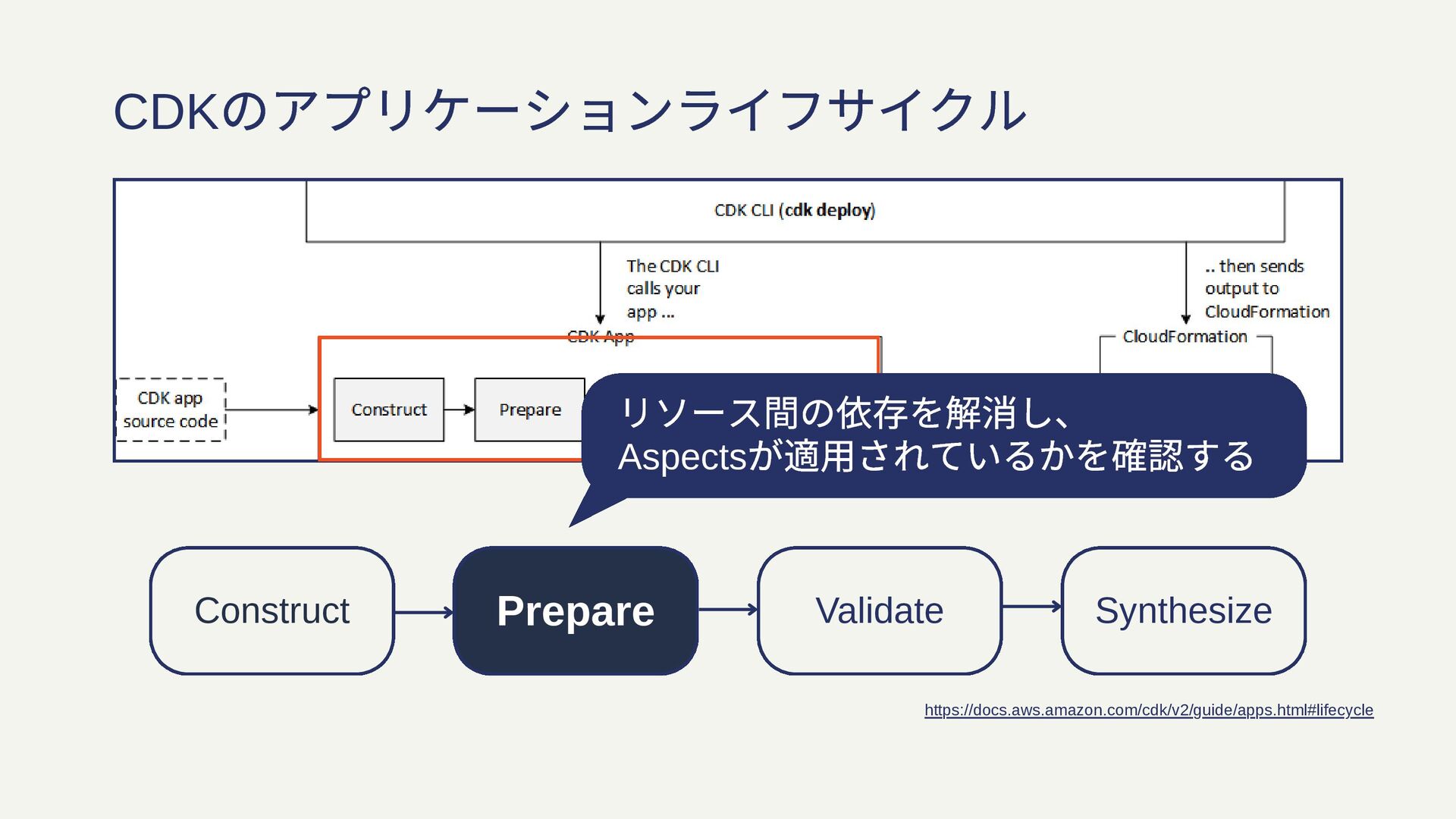 Construct Prepare Validate Synthesize CDK のアプリケーションライフサイクル リソース間の依存を解消し、 Aspects が適用されているかを確認する https://docs.aws.amazon.com/cdk/v2/guide/apps.html#lifecycle