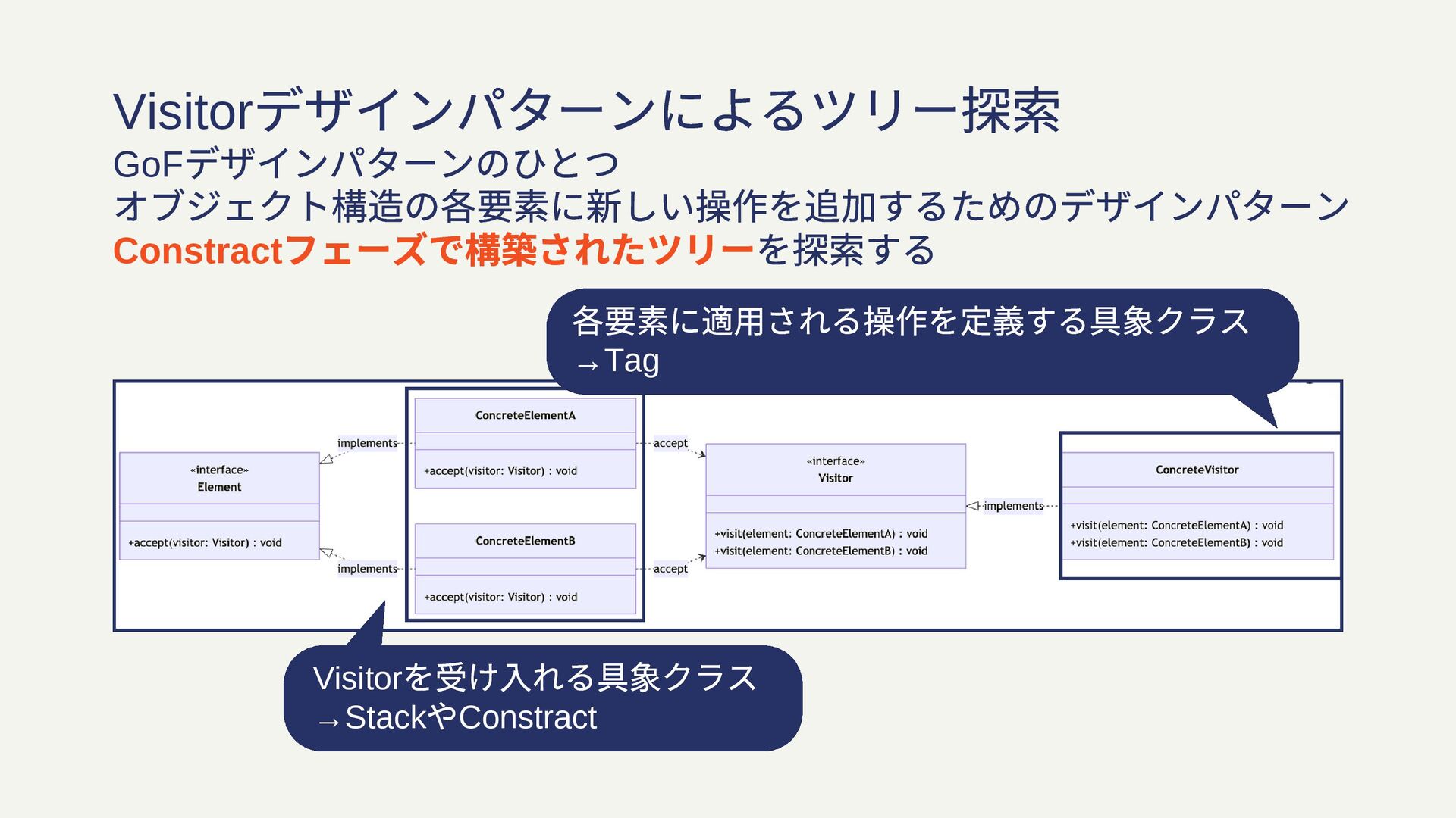 Visitor デザインパターンによるツリー探索 GoF デザインパターンのひとつ オブジェクト構造の各要素に新しい操作を追加するためのデザインパターン Constract フェーズで構築されたツリーを探索する Visitor を受け入れる具象クラス →Stack