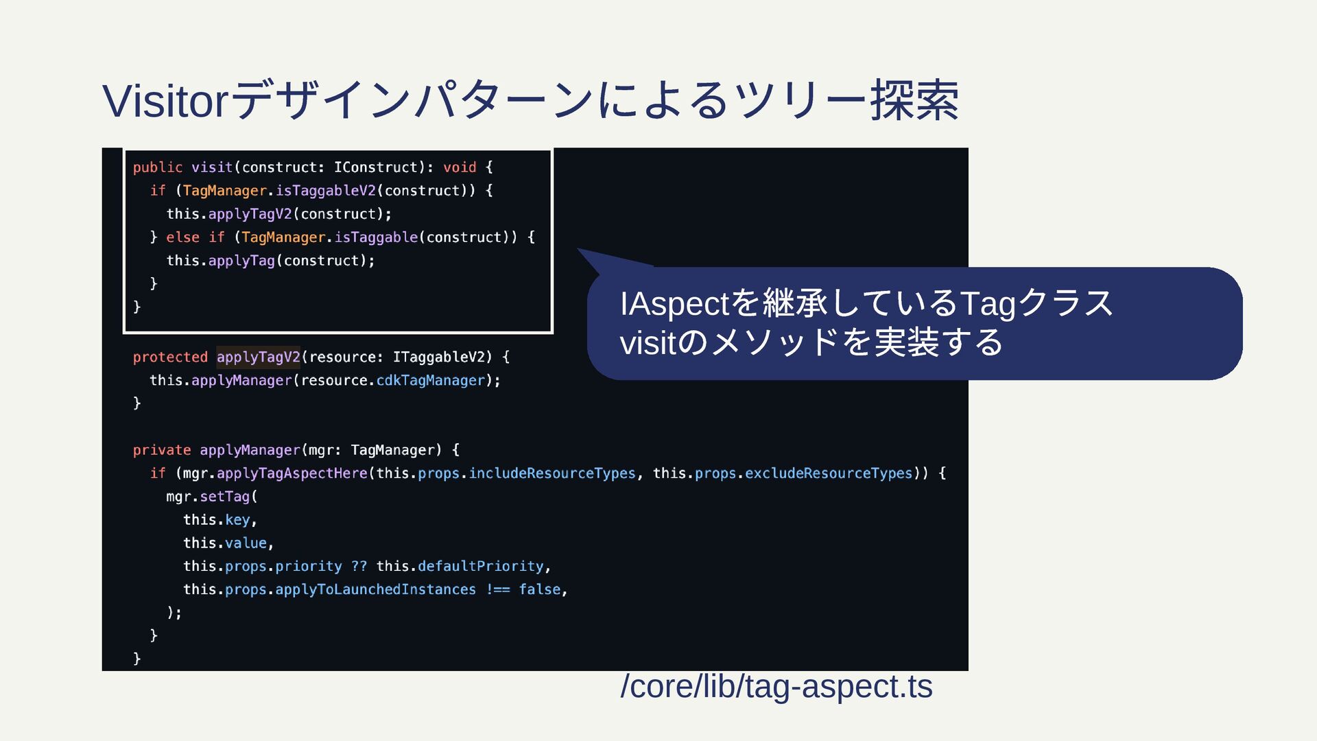 IAspect を継承しているTag クラス visit のメソッドを実装する Visitor デザインパターンによるツリー探索 /core/lib/tag-aspect.ts