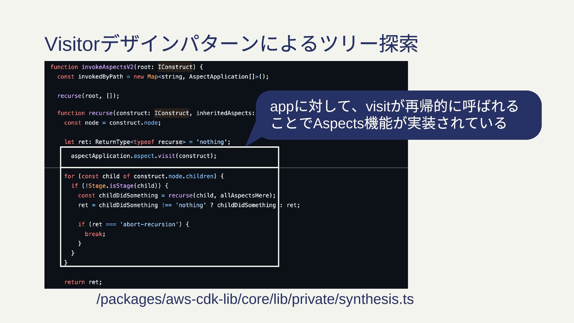 app に対して、visit が再帰的に呼ばれる ことでAspects 機能が実装されている Visitor デザインパターンによるツリー探索 /packages/aws-cdk-lib/core/lib/private/synthesis.ts