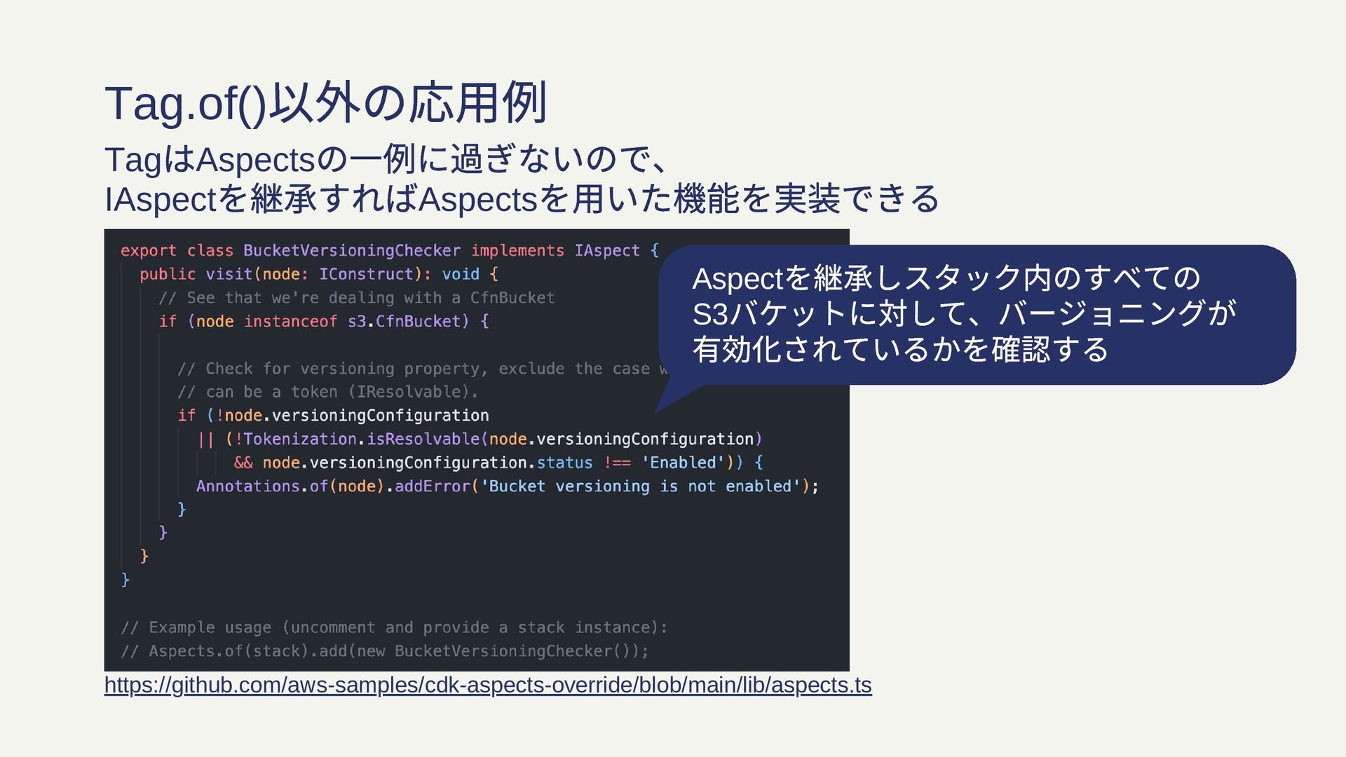 Aspect を継承しスタック内のすべての S3 バケットに対して、バージョニングが 有効化されているかを確認する Tag.of() 以外の応用例 Tag はAspects の一例に過ぎないので、
