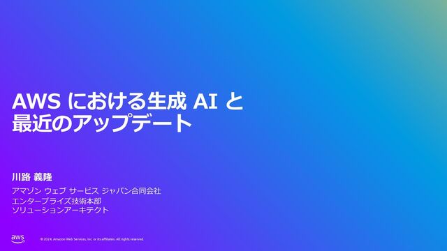 rights reserved. • Amazon Aurora や Amazon DynamoDB, Amazon S3 などの AWS サービスや、 Salesforce などの外部サービスをデータソースとして利⽤できる • API コネクタを介してサードパーティサービスと連携も可能 48 ⽣ 成 A I を 活 ⽤ し 、 ⾃ 然 ⾔ 語 に よ っ て 、 複 数 の ペ ー ジ か ら 構 成 さ れ る ユ ー ザ イ ン タ フ ェ ー ス や デ ー タ モ デ ル 、 ビ ジ ネ ス ロ ジ ッ ク を 含 む エ ン タ ー プ ラ イ ズ グ レ ー ド の ア プ リ ケ ー シ ョ ン を 作 成 AWS App Studio PREVIEW https://aws.amazon.com/jp/blogs/machine-learning/fine-tune-anthropics-claude-3-haiku-in-amazon-bedrock-to-boost-model-accuracy-and-quality/