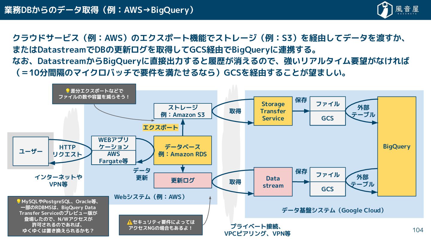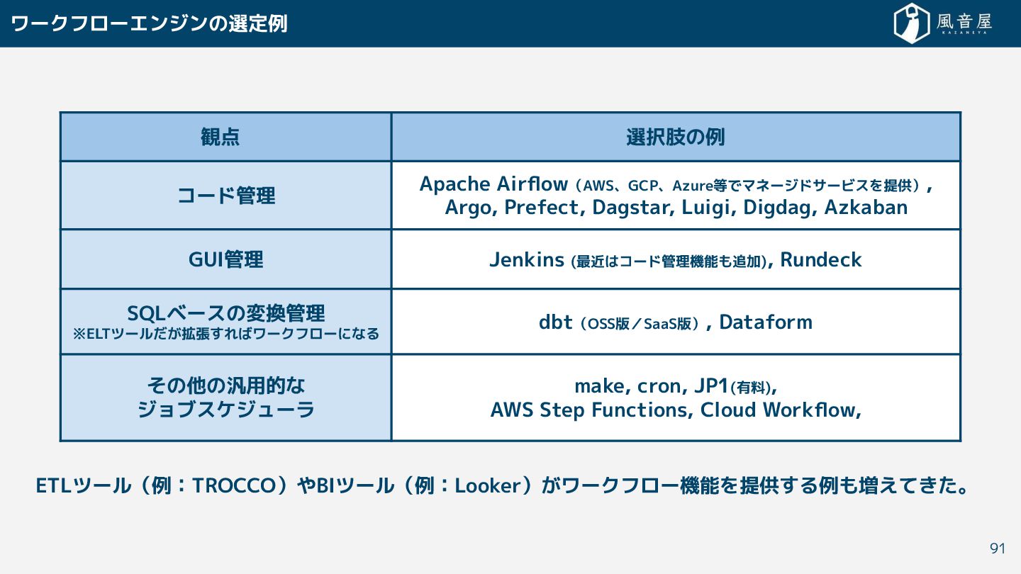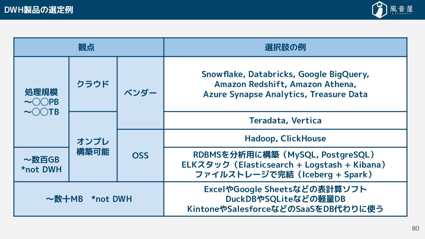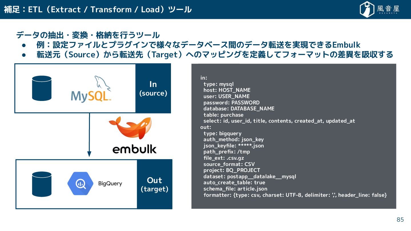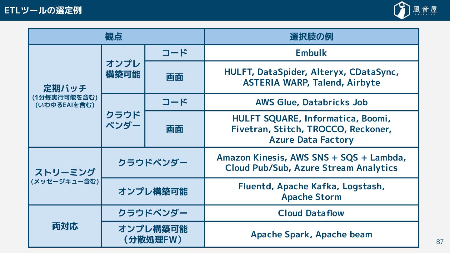 Embulk 画面 HULFT, DataSpider, Alteryx, CDataSync, ASTERIA WARP, Talend, Airbyte クラウド ベンダー コード AWS Glue, Databricks Job 画面 HULFT SQUARE, Informatica, Boomi, Fivetran, Stitch, TROCCO, Reckoner, Azure Data Factory ストリーミング (メッセージキュー含む) クラウドベンダー Amazon Kinesis, AWS SNS + SQS + Lambda, Cloud Pub/Sub, Azure Stream Analytics オンプレ構築可能 Fluentd, Apache Kafka, Logstash, Apache Storm 両対応 クラウドベンダー Cloud Dataflow オンプレ構築可能 (分散処理FW) Apache Spark, Apache beam