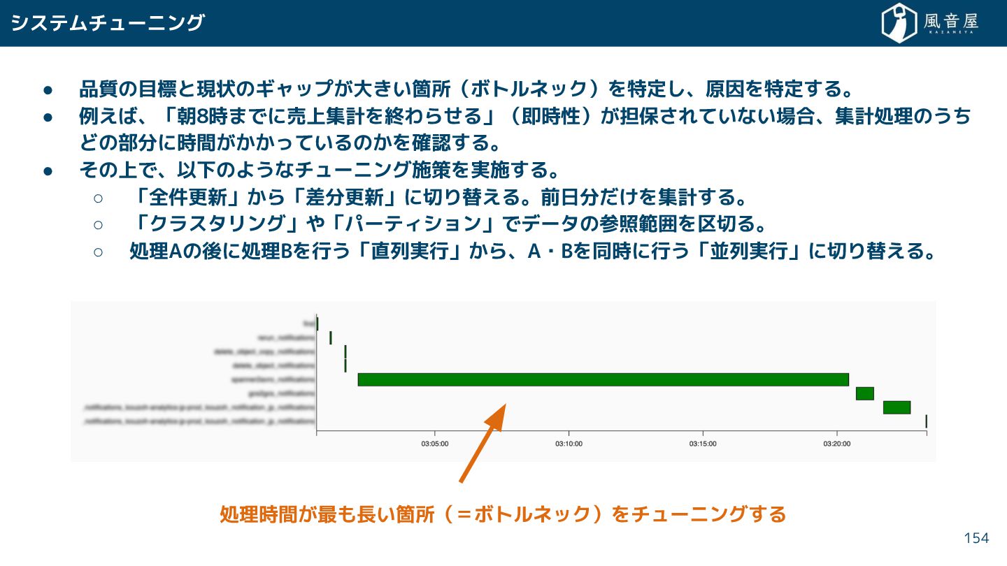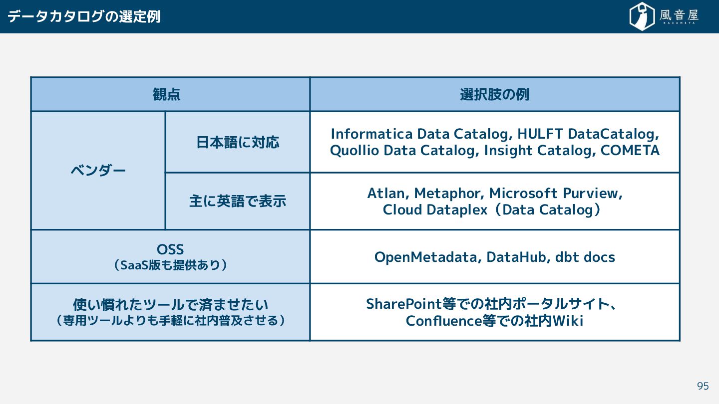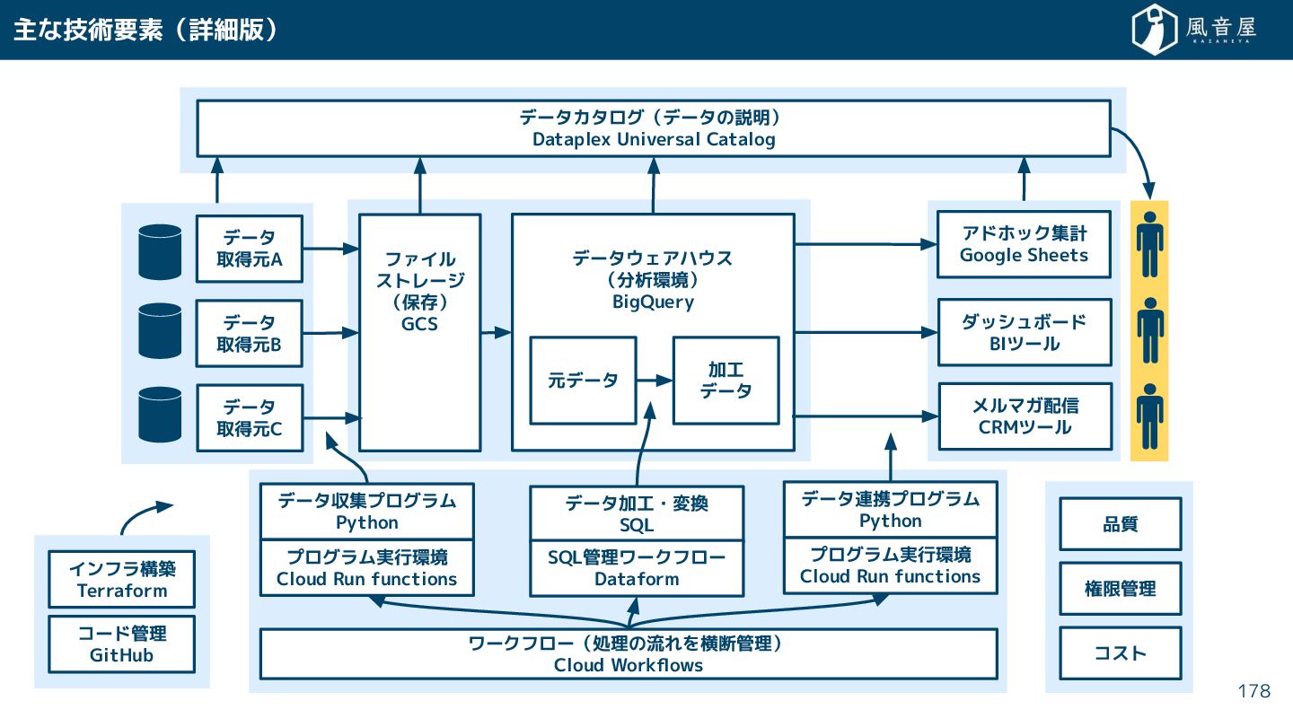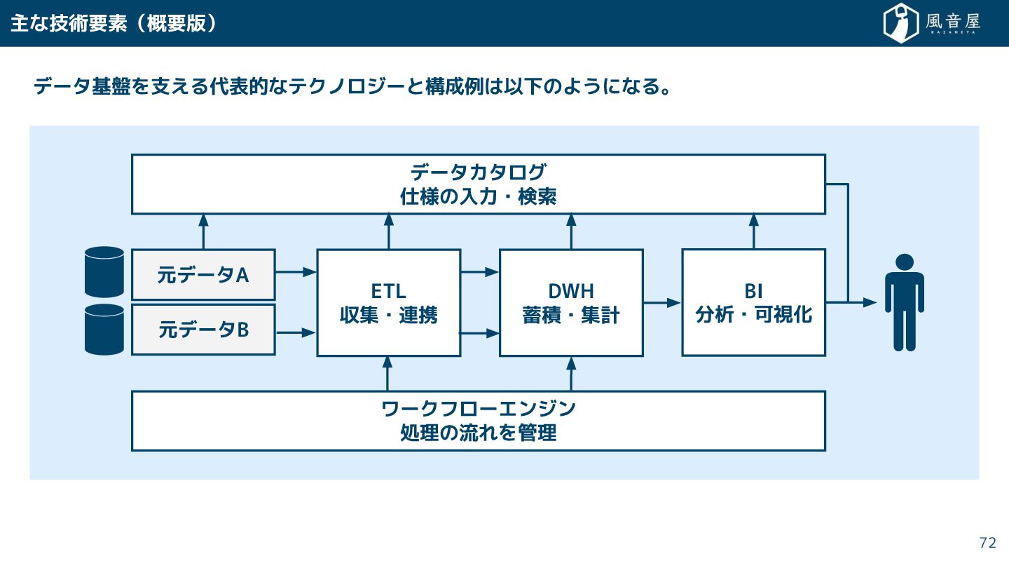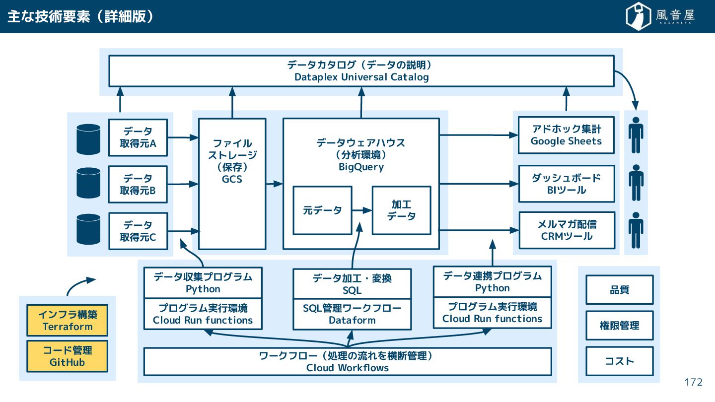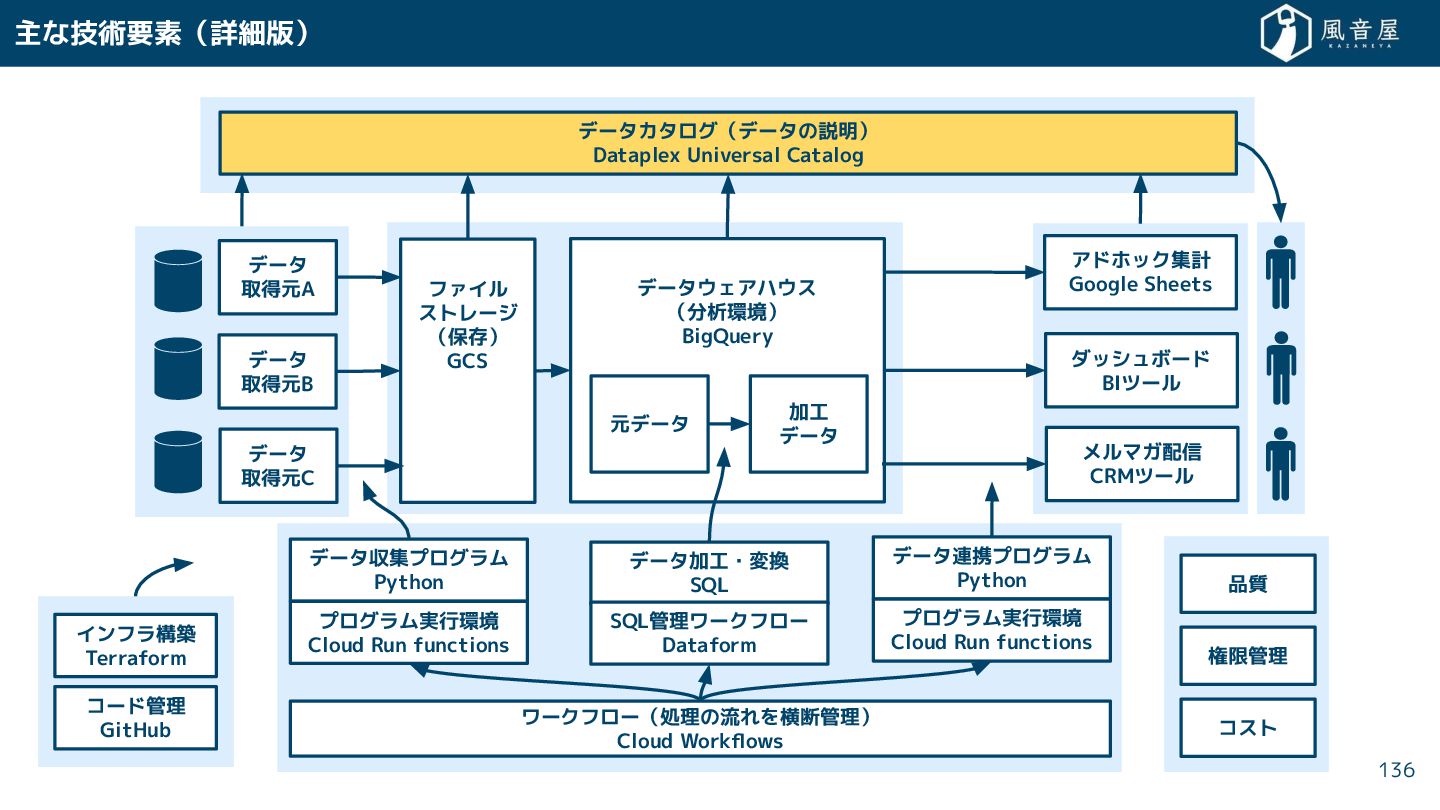 Embulk 画面 HULFT, DataSpider, Alteryx, CDataSync, ASTERIA WARP, Talend, Airbyte クラウド ベンダー コード AWS Glue, Databricks Job 画面 HULFT SQUARE, Informatica, Boomi, Fivetran, Stitch, TROCCO, Reckoner, Azure Data Factory ストリーミング (メッセージキュー含む) クラウドベンダー Amazon Kinesis, AWS SNS + SQS + Lambda, Cloud Pub/Sub, Azure Stream Analytics オンプレ構築可能 Fluentd, Apache Kafka, Logstash, Apache Storm 両対応 クラウドベンダー Cloud Dataflow オンプレ構築可能 (分散処理FW) Apache Spark, Apache beam