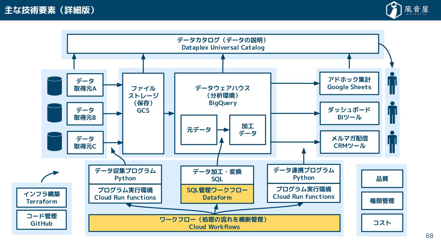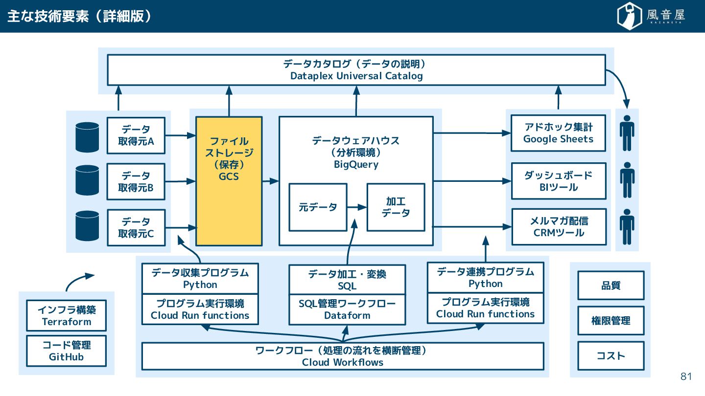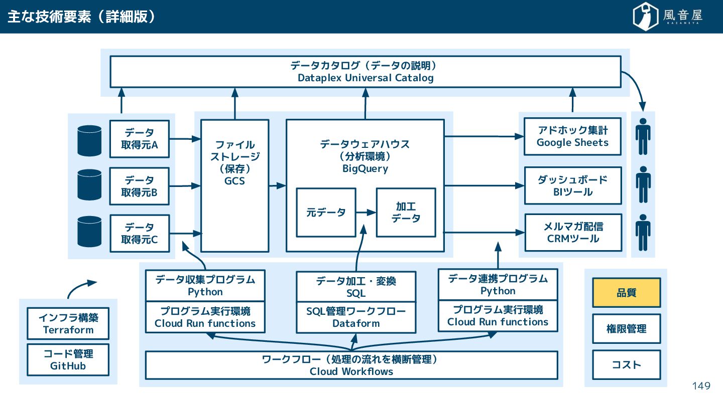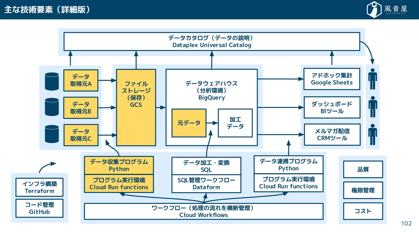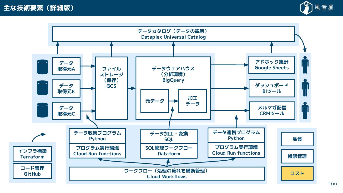 Embulk 画面 HULFT, DataSpider, Alteryx, CDataSync, ASTERIA WARP, Talend, Airbyte クラウド ベンダー コード AWS Glue, Databricks Job 画面 HULFT SQUARE, Informatica, Boomi, Fivetran, Stitch, TROCCO, Reckoner, Azure Data Factory ストリーミング (メッセージキュー含む) クラウドベンダー Amazon Kinesis, AWS SNS + SQS + Lambda, Cloud Pub/Sub, Azure Stream Analytics オンプレ構築可能 Fluentd, Apache Kafka, Logstash, Apache Storm 両対応 クラウドベンダー Cloud Dataflow オンプレ構築可能 (分散処理FW) Apache Spark, Apache beam