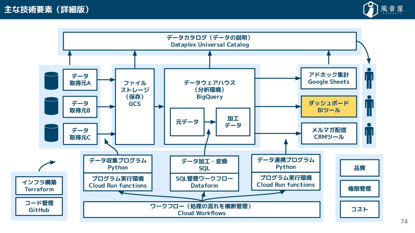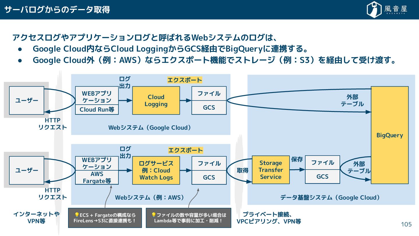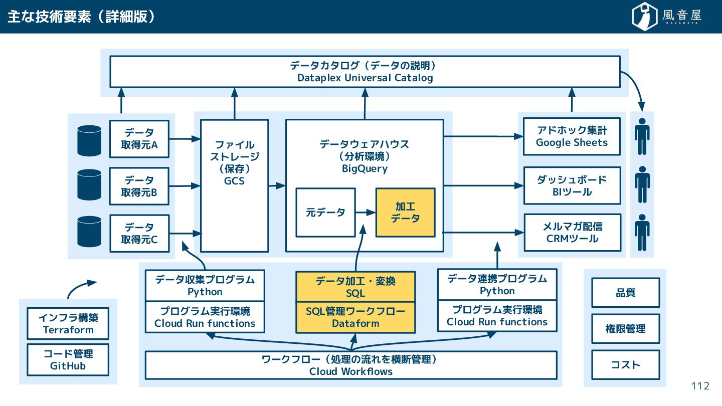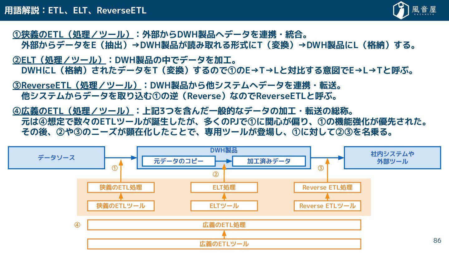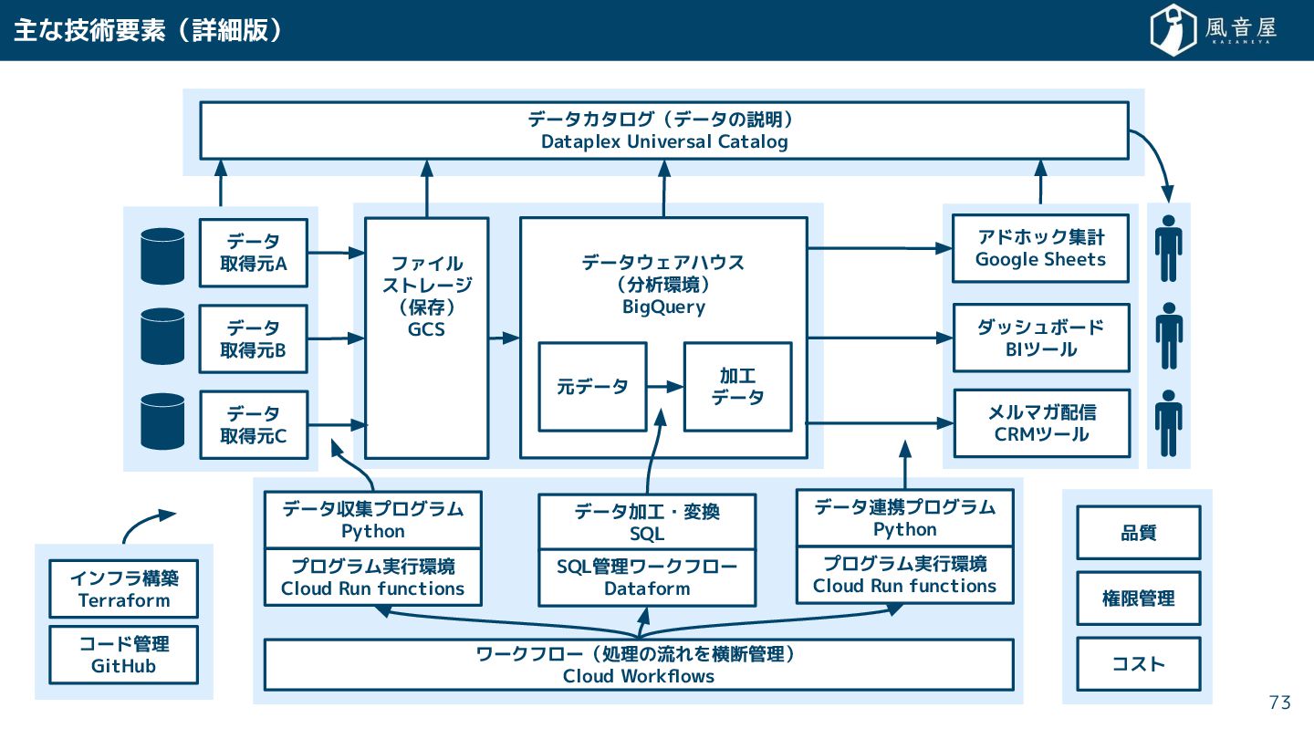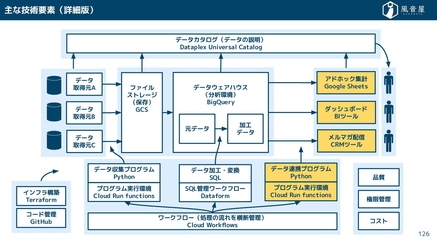 Embulk 画面 HULFT, DataSpider, Alteryx, CDataSync, ASTERIA WARP, Talend, Airbyte クラウド ベンダー コード AWS Glue, Databricks Job 画面 HULFT SQUARE, Informatica, Boomi, Fivetran, Stitch, TROCCO, Reckoner, Azure Data Factory ストリーミング (メッセージキュー含む) クラウドベンダー Amazon Kinesis, AWS SNS + SQS + Lambda, Cloud Pub/Sub, Azure Stream Analytics オンプレ構築可能 Fluentd, Apache Kafka, Logstash, Apache Storm 両対応 クラウドベンダー Cloud Dataflow オンプレ構築可能 (分散処理FW) Apache Spark, Apache beam