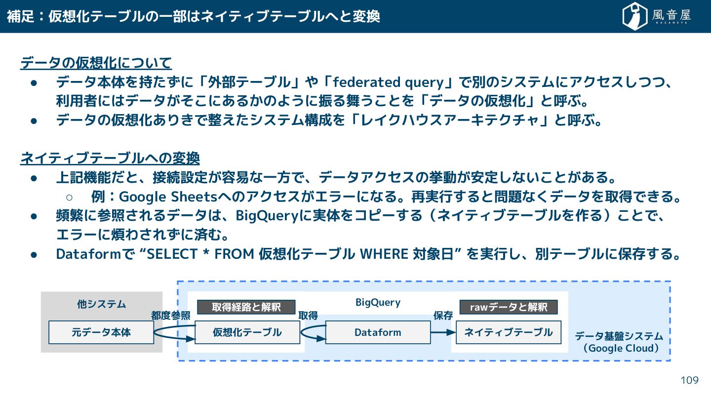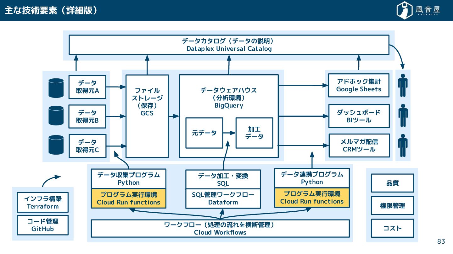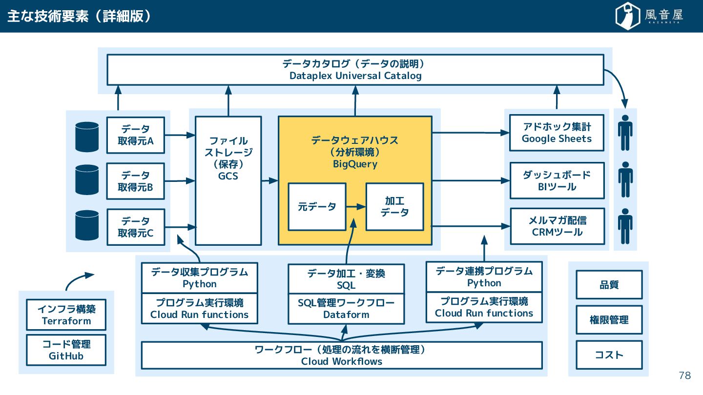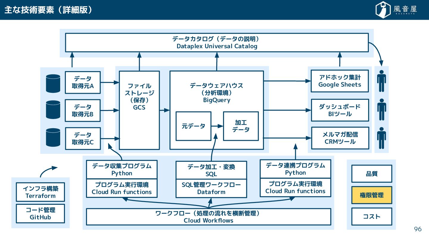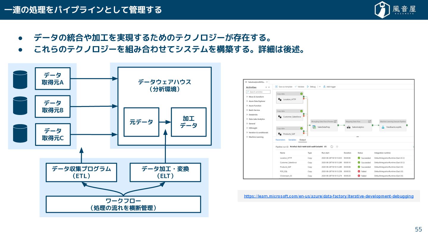 Embulk 画面 HULFT, DataSpider, Alteryx, CDataSync, ASTERIA WARP, Talend, Airbyte クラウド ベンダー コード AWS Glue, Databricks Job 画面 HULFT SQUARE, Informatica, Boomi, Fivetran, Stitch, TROCCO, Reckoner, Azure Data Factory ストリーミング (メッセージキュー含む) クラウドベンダー Amazon Kinesis, AWS SNS + SQS + Lambda, Cloud Pub/Sub, Azure Stream Analytics オンプレ構築可能 Fluentd, Apache Kafka, Logstash, Apache Storm 両対応 クラウドベンダー Cloud Dataflow オンプレ構築可能 (分散処理FW) Apache Spark, Apache beam