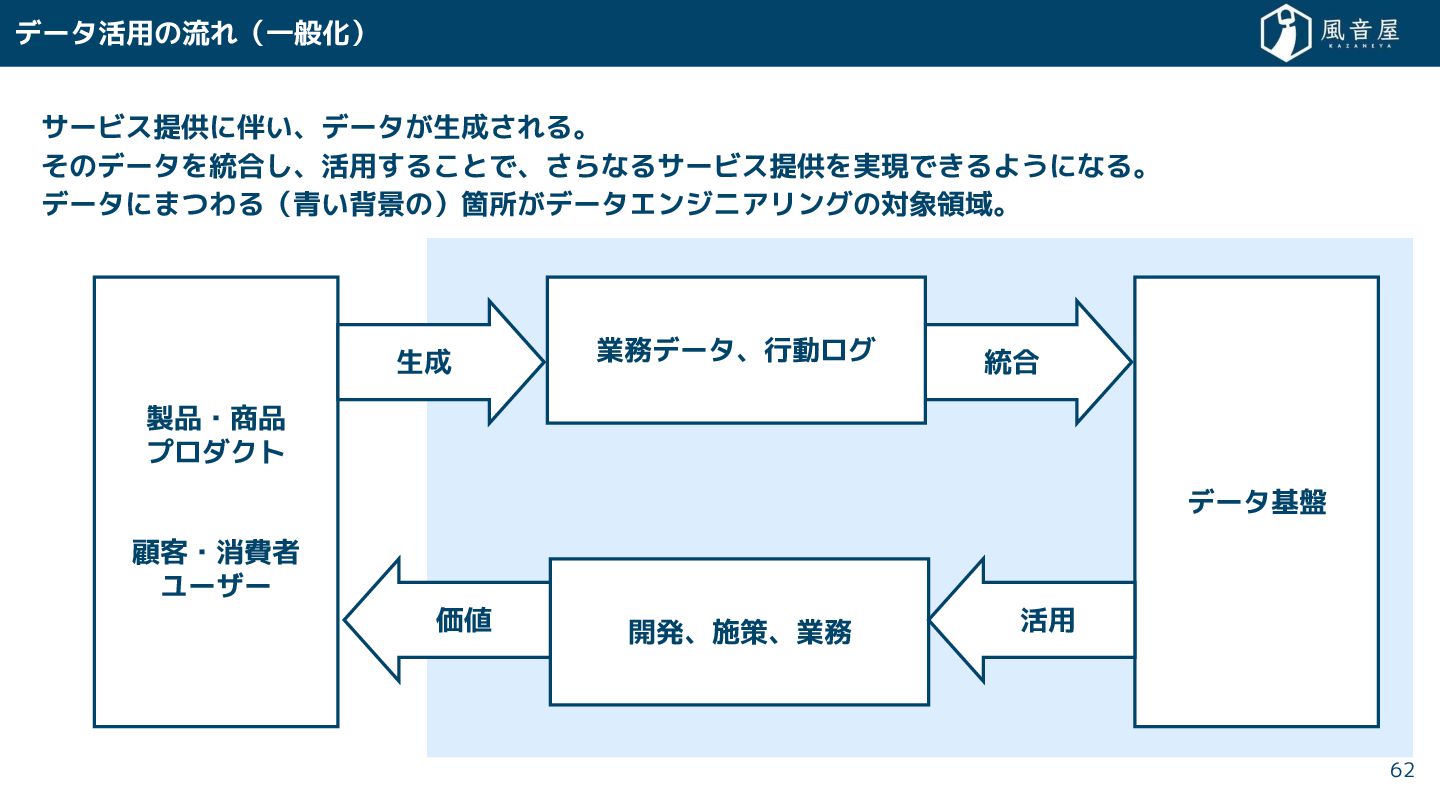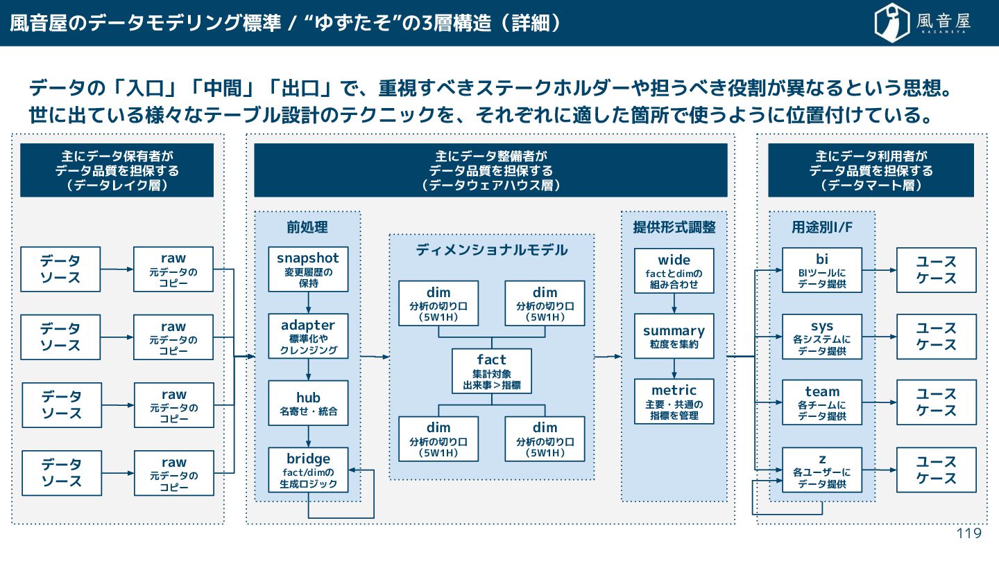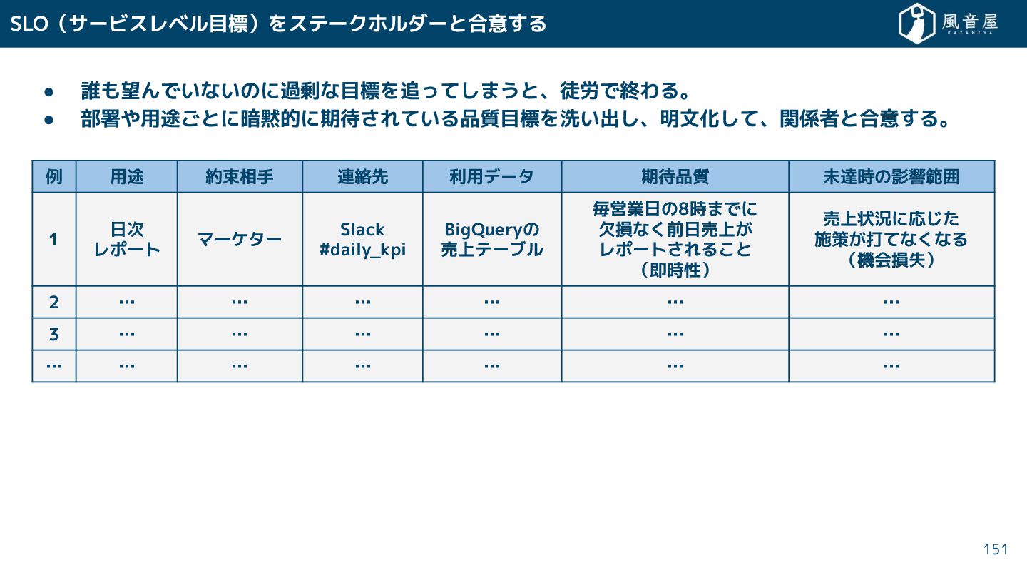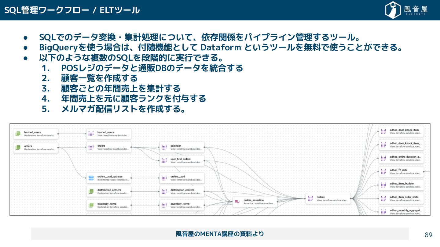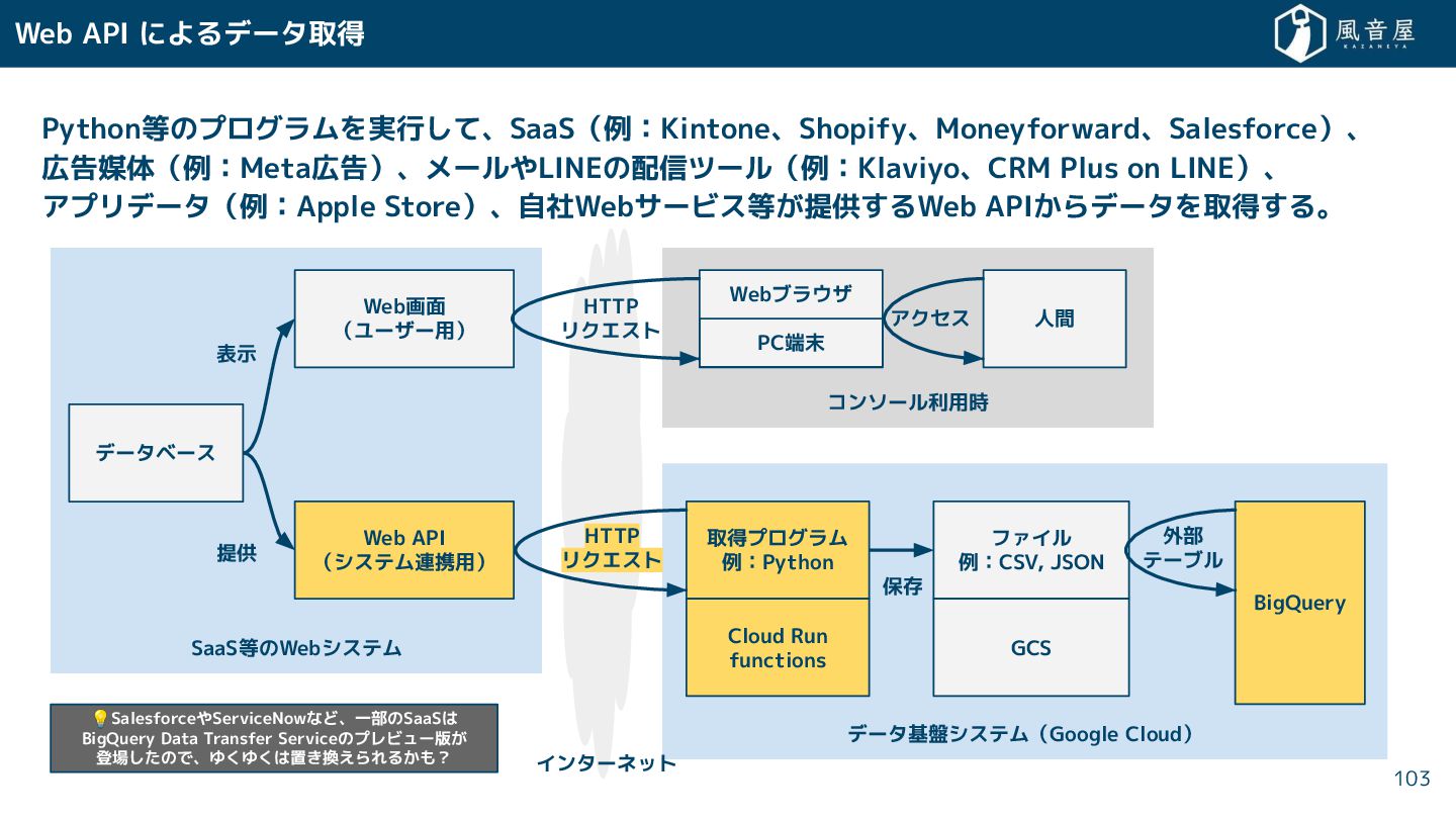 Embulk 画面 HULFT, DataSpider, Alteryx, CDataSync, ASTERIA WARP, Talend, Airbyte クラウド ベンダー コード AWS Glue, Databricks Job 画面 HULFT SQUARE, Informatica, Boomi, Fivetran, Stitch, TROCCO, Reckoner, Azure Data Factory ストリーミング (メッセージキュー含む) クラウドベンダー Amazon Kinesis, AWS SNS + SQS + Lambda, Cloud Pub/Sub, Azure Stream Analytics オンプレ構築可能 Fluentd, Apache Kafka, Logstash, Apache Storm 両対応 クラウドベンダー Cloud Dataflow オンプレ構築可能 (分散処理FW) Apache Spark, Apache beam