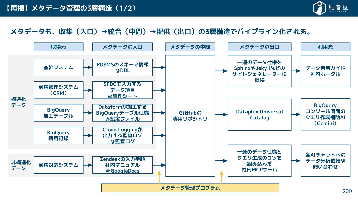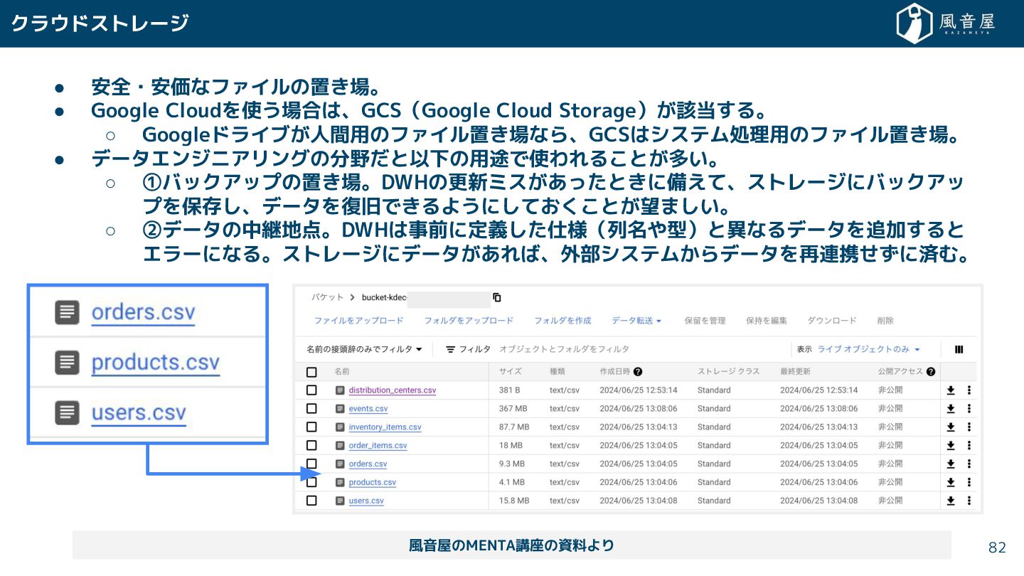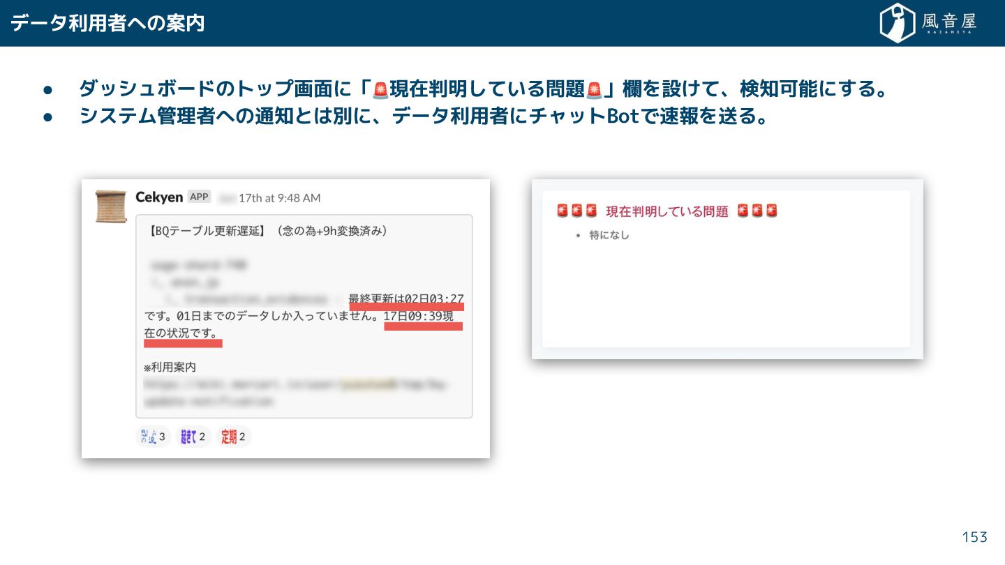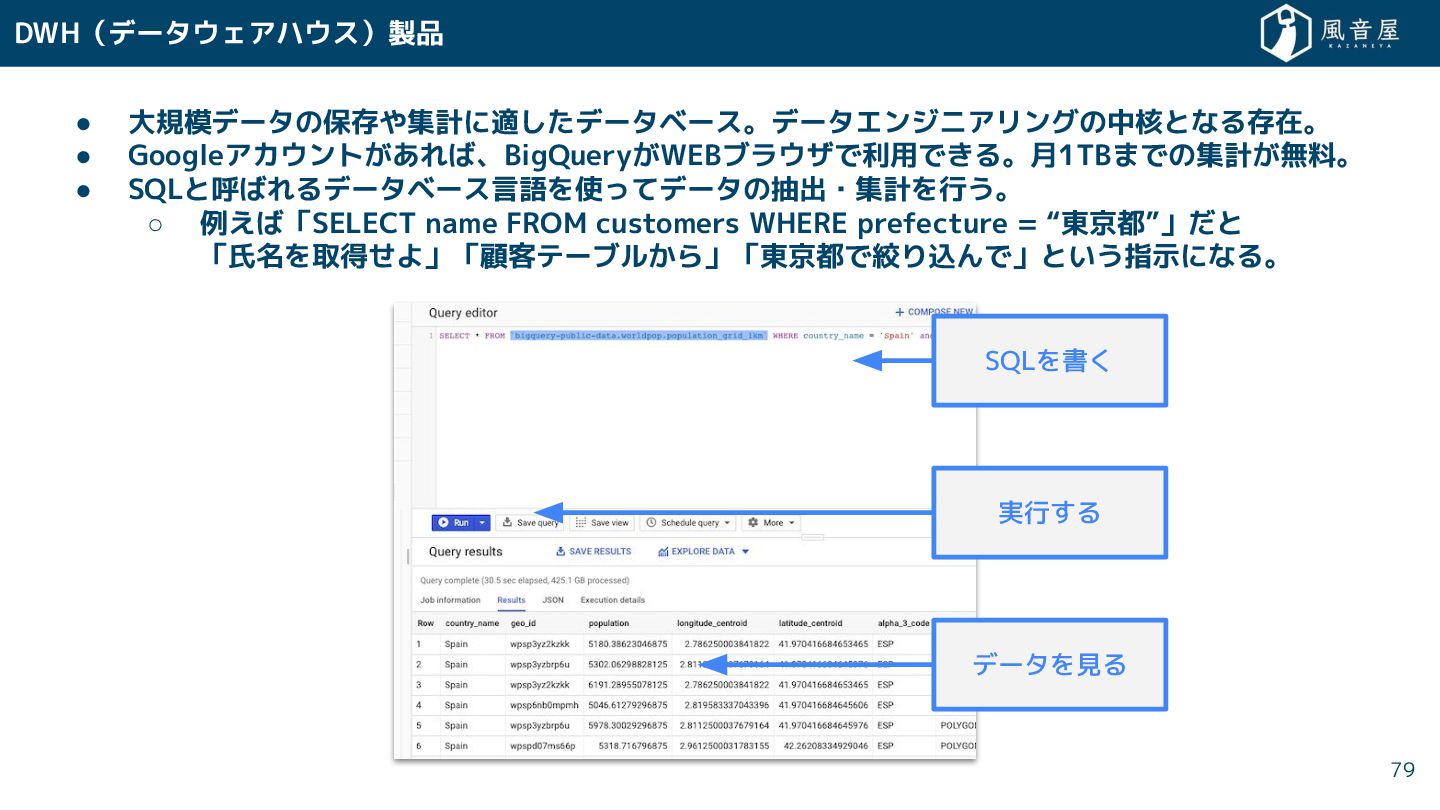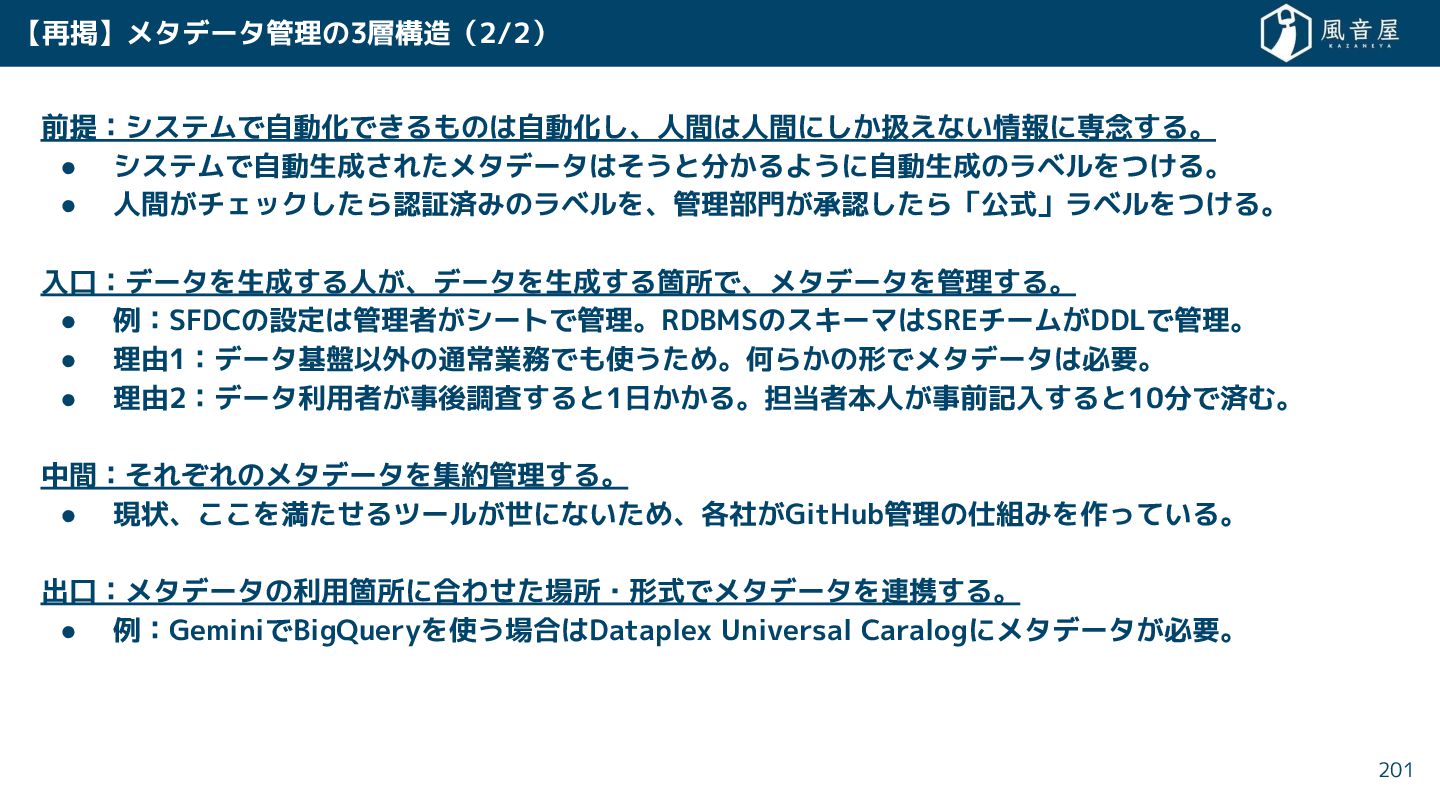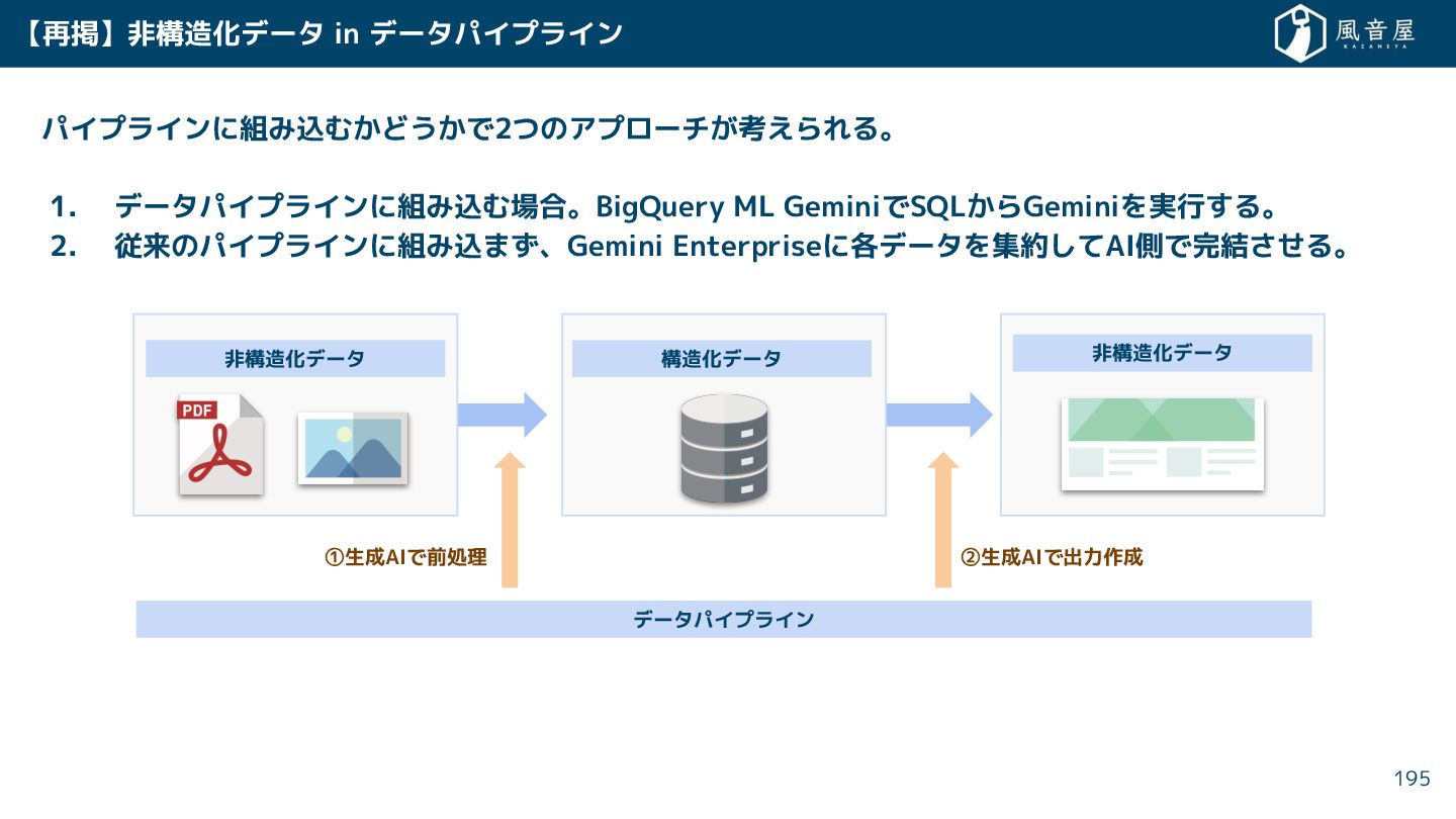 Embulk 画面 HULFT, DataSpider, Alteryx, CDataSync, ASTERIA WARP, Talend, Airbyte クラウド ベンダー コード AWS Glue, Databricks Job 画面 HULFT SQUARE, Informatica, Boomi, Fivetran, Stitch, TROCCO, Reckoner, Azure Data Factory ストリーミング (メッセージキュー含む) クラウドベンダー Amazon Kinesis, AWS SNS + SQS + Lambda, Cloud Pub/Sub, Azure Stream Analytics オンプレ構築可能 Fluentd, Apache Kafka, Logstash, Apache Storm 両対応 クラウドベンダー Cloud Dataflow オンプレ構築可能 (分散処理FW) Apache Spark, Apache beam