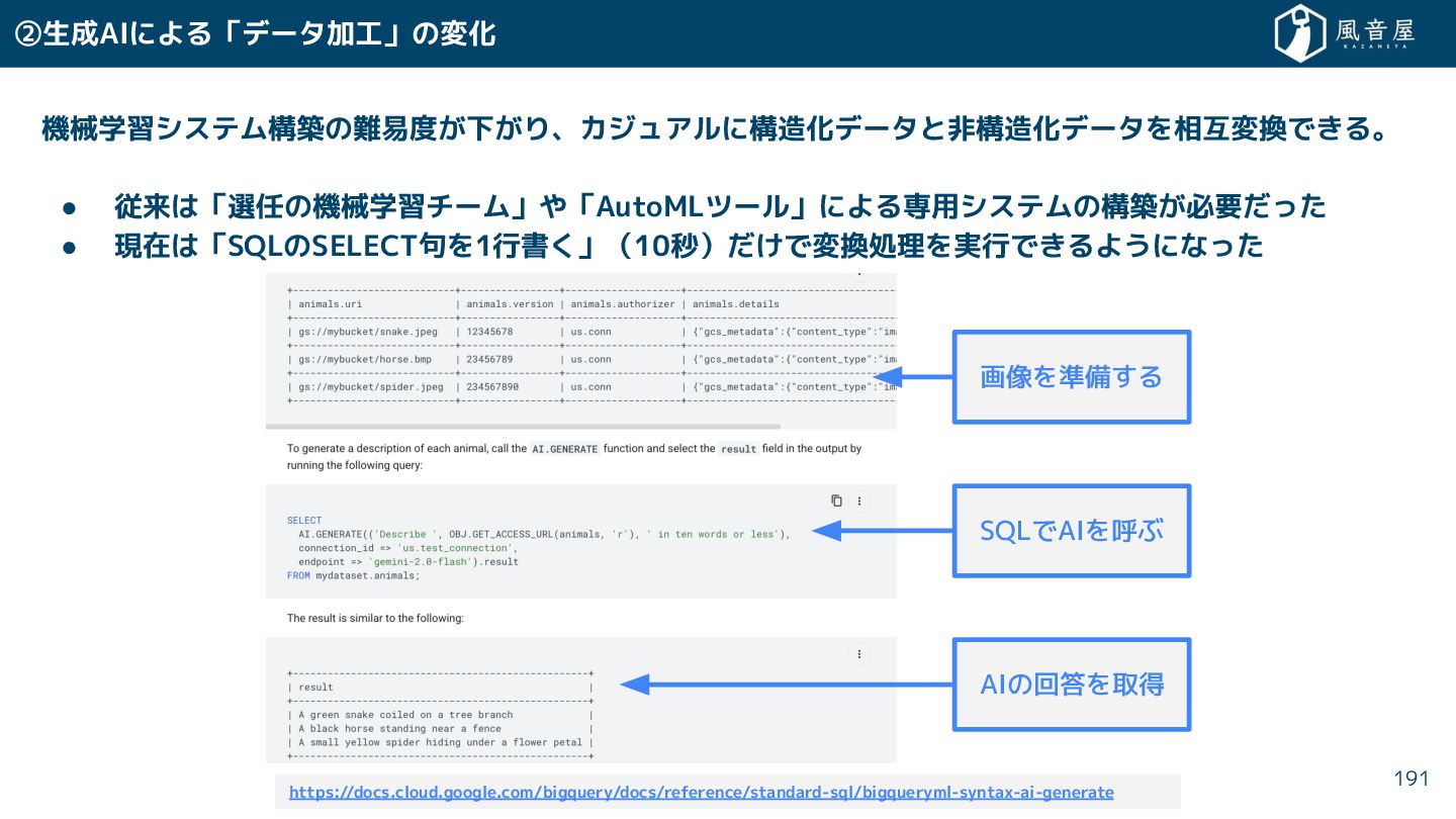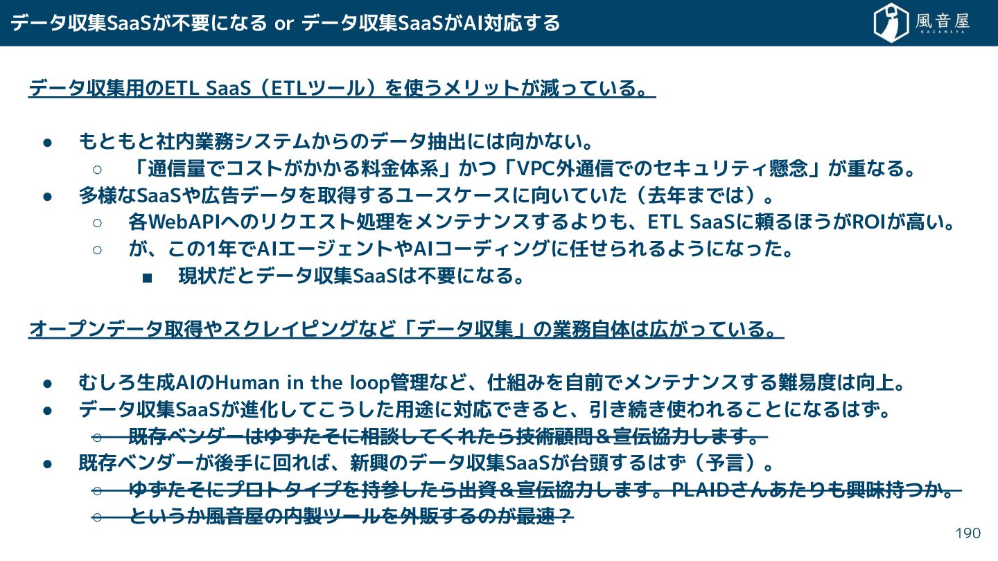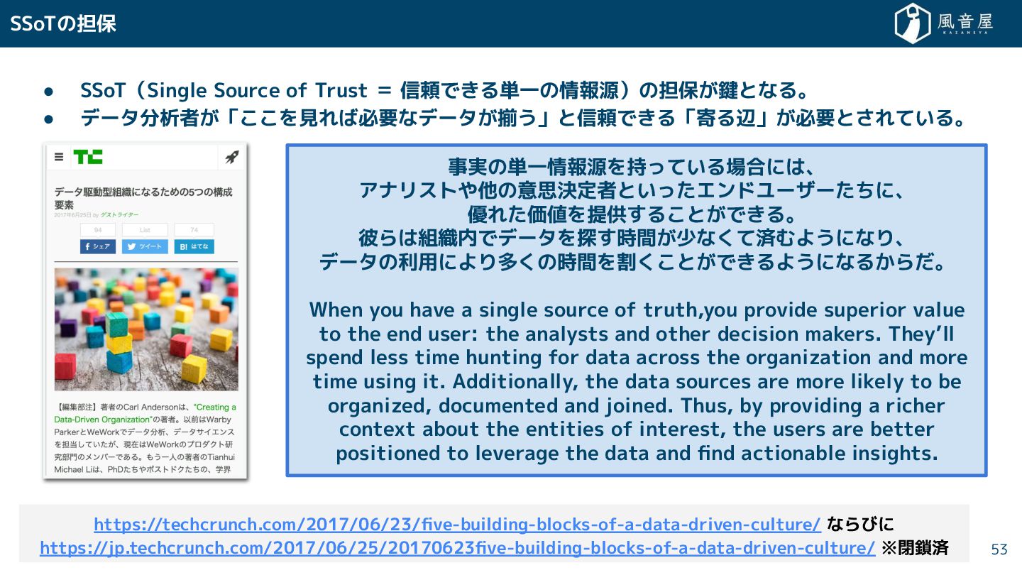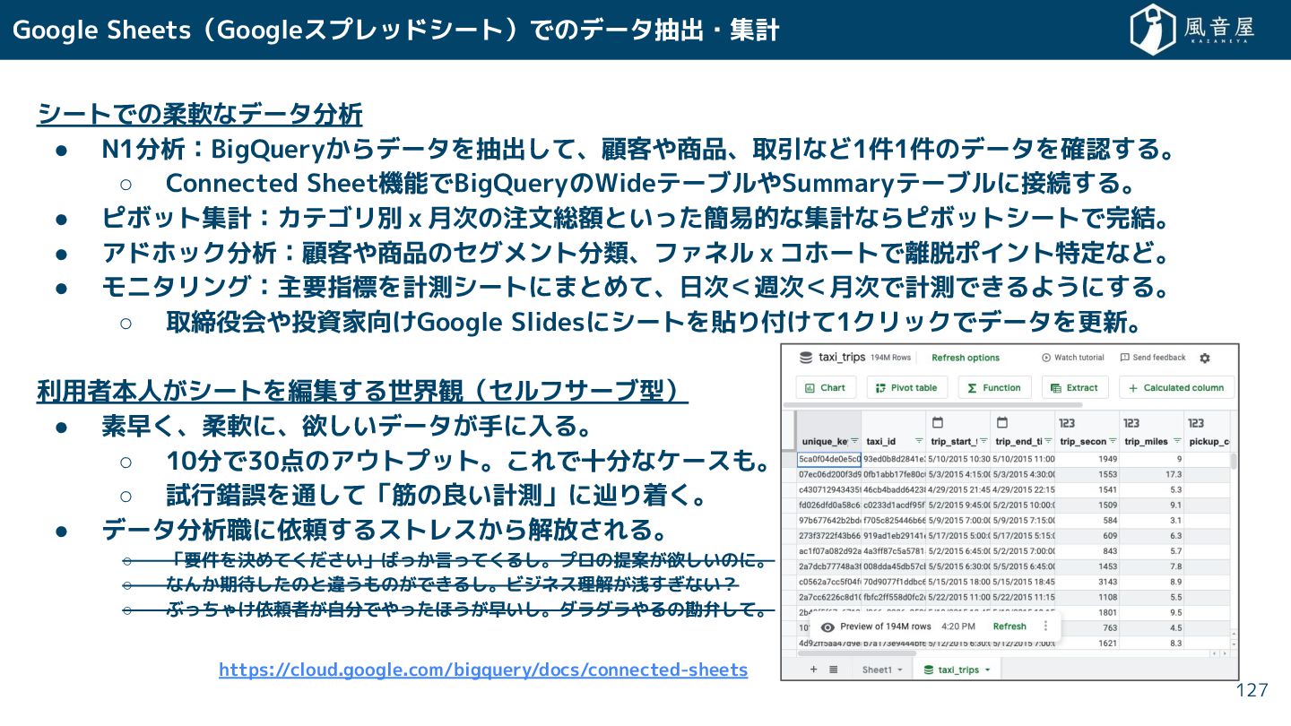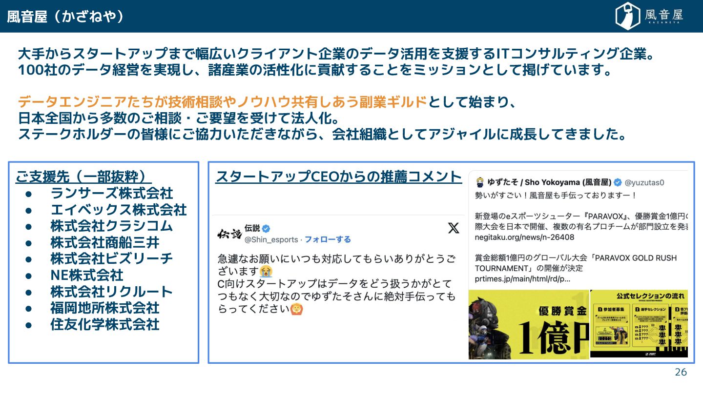 Embulk 画面 HULFT, DataSpider, Alteryx, CDataSync, ASTERIA WARP, Talend, Airbyte クラウド ベンダー コード AWS Glue, Databricks Job 画面 HULFT SQUARE, Informatica, Boomi, Fivetran, Stitch, TROCCO, Reckoner, Azure Data Factory ストリーミング (メッセージキュー含む) クラウドベンダー Amazon Kinesis, AWS SNS + SQS + Lambda, Cloud Pub/Sub, Azure Stream Analytics オンプレ構築可能 Fluentd, Apache Kafka, Logstash, Apache Storm 両対応 クラウドベンダー Cloud Dataflow オンプレ構築可能 (分散処理FW) Apache Spark, Apache beam