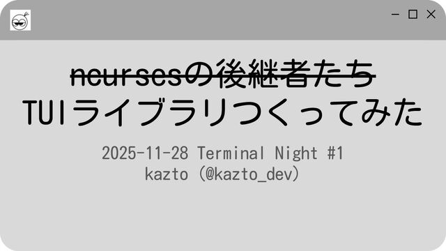 ncursesの後継者たち TUIライブラリつくってみた 2025-11-28 Terminal Night #1 kazto (@kazto_dev)