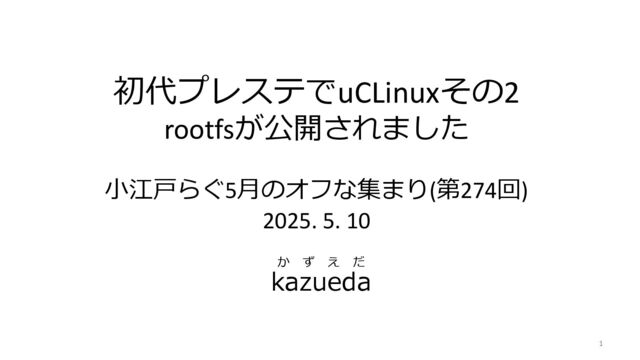 SIO経由のシリアルコンソール • プレイステーションのGPU経由の仮想コンソール • 保存メディアとしてマルチプルメモリーカード • SL811を使って、USBキーボードやマウスを接続 • 上記の環境が構築されるらしい。。。 7 https://en.wikipedia.org/wiki/PSXLinux • 1枚のメモリーカードの容量:112 kB (8 kB x 14) • 複数のカードを切り替えて使用? • カードへの書き込みフォーマットは? <-ブロックデバイスとして利用? • カード上のinitファイルを読み込めるようにする。 <-ファイル名「init」のHello Wolrdを作成し、 「Hello World」表示後にKernel panicを。