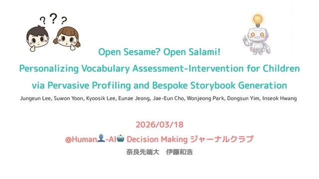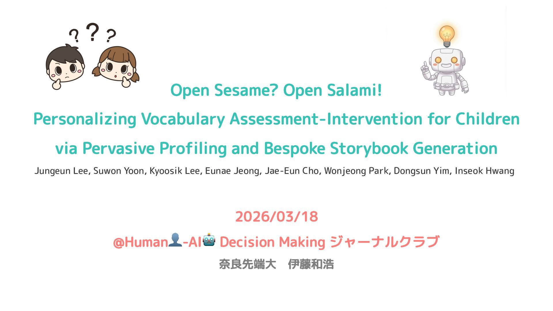 Pervasive Profiling and Bespoke Storybook Generation 2026/03/18 @Human👤-AI🤖 Decision Making ジャーナルクラブ 奈良先端大 伊藤和浩 Jungeun Lee, Suwon Yoon, Kyoosik Lee, Eunae Jeong, Jae-Eun Cho, Wonjeong Park, Dongsun Yim, Inseok Hwang