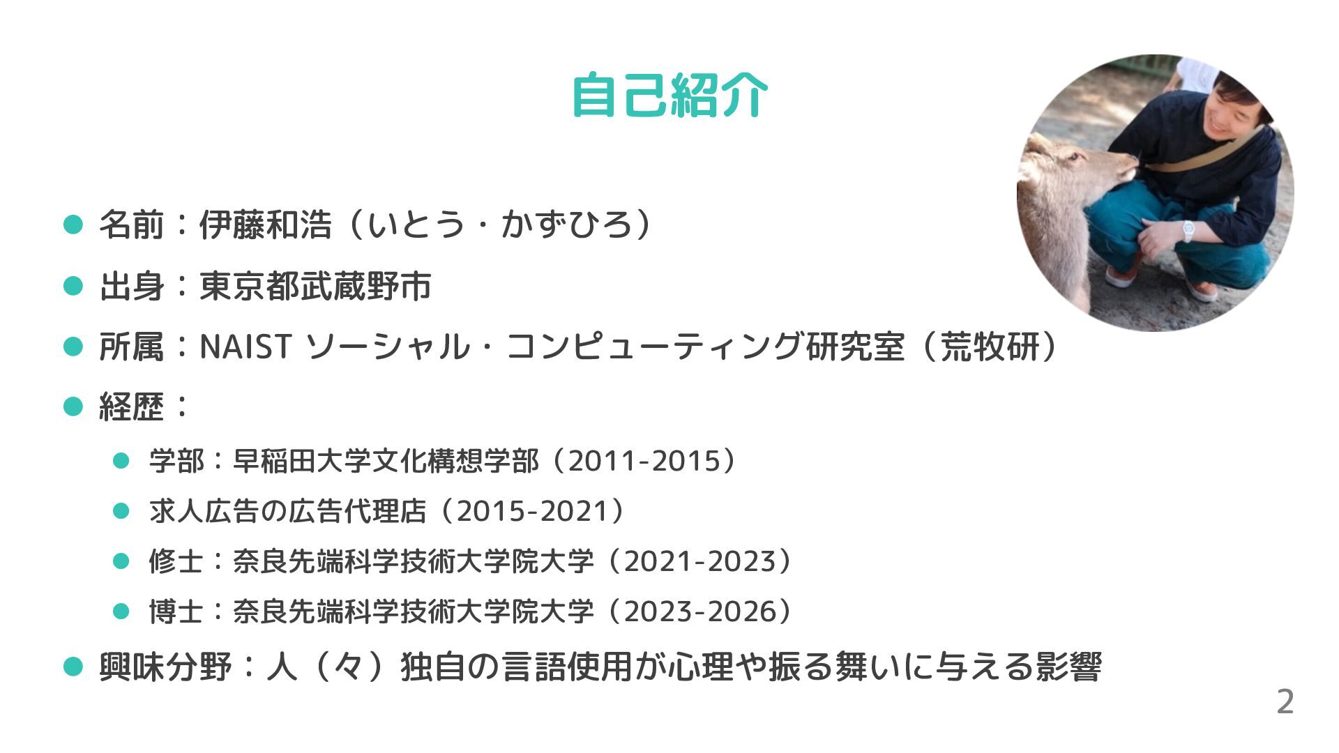 2. l 名前:伊藤和浩(いとう・かずひろ) l 出身:東京都武蔵野市 l 所属:NAIST ソーシャル・コンピューティング研究室(荒牧研) l 経歴: l