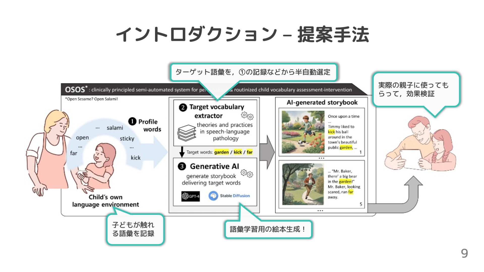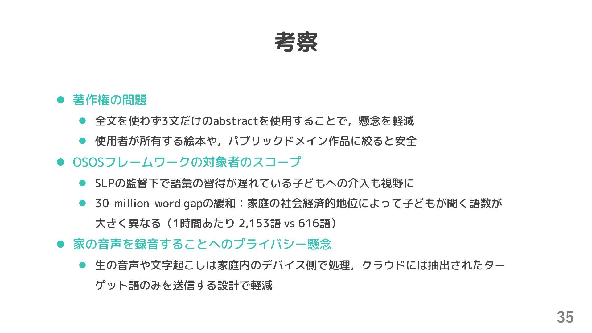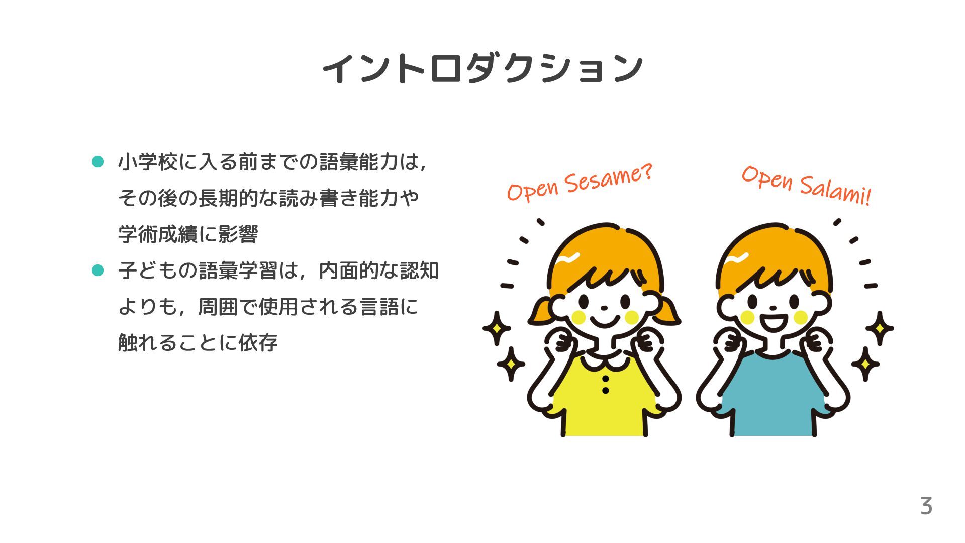 l SLPの監督下で語彙の習得が遅れている子どもへの介入も視野に l 30-million-word gapの緩和:家庭の社会経済的地位によって子どもが聞く語数が 大きく異なる(1時間あたり 2,153語 vs 616語) l 家の音声を録音することへのプライバシー懸念 l 生の音声や文字起こしは家庭内のデバイス側で処理,クラウドには抽出されたター ゲット語のみを送信する設計で軽減