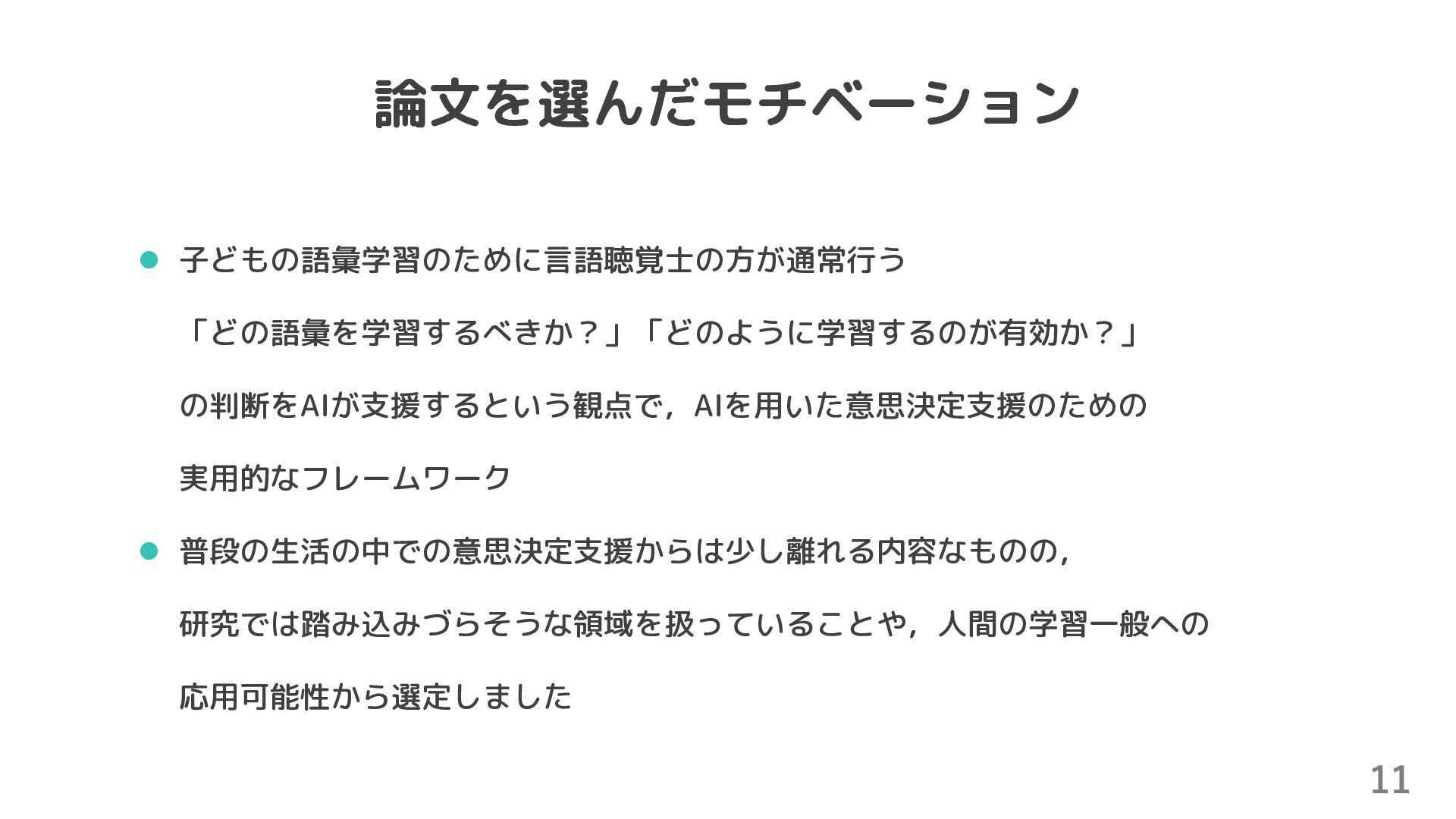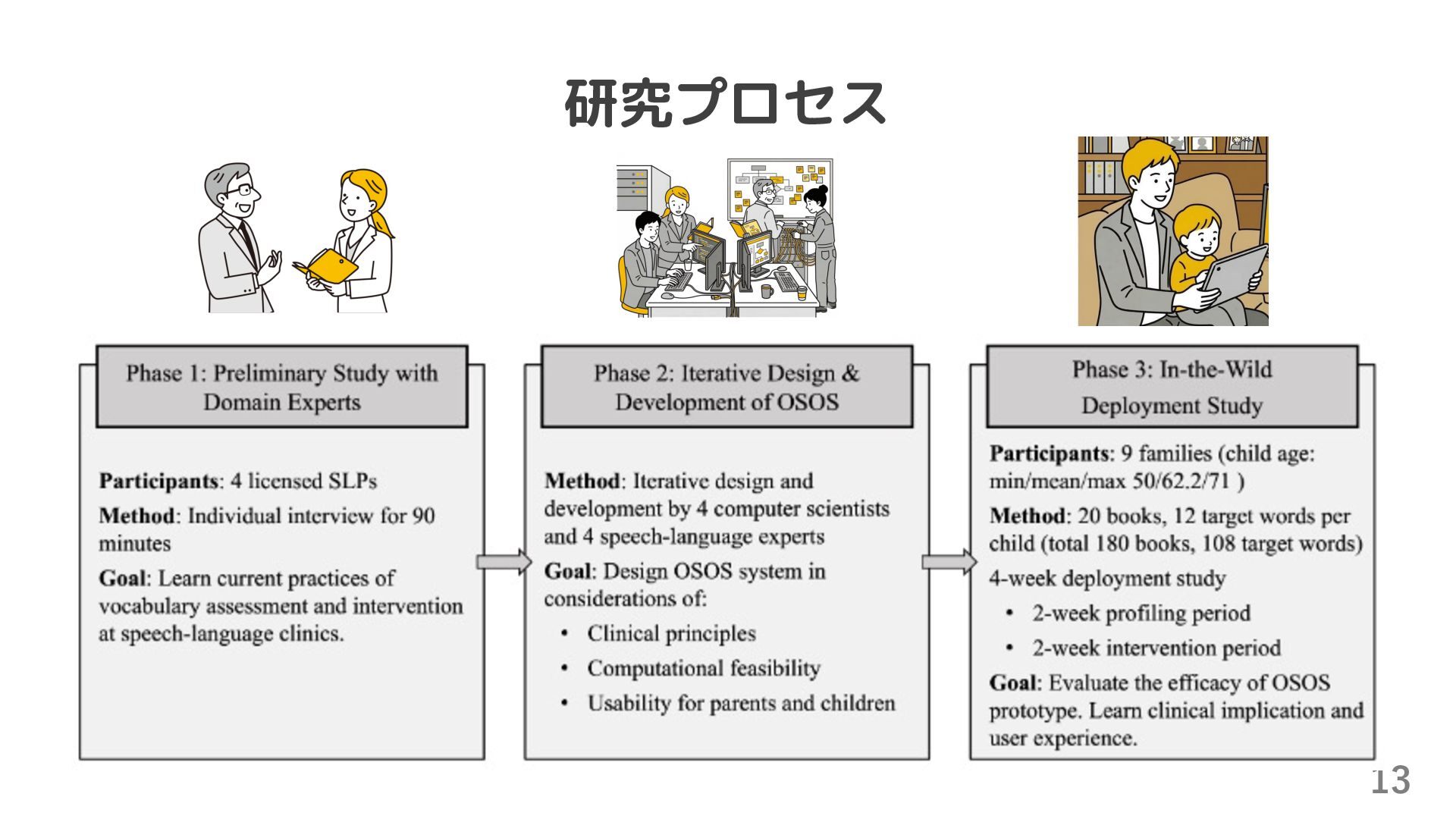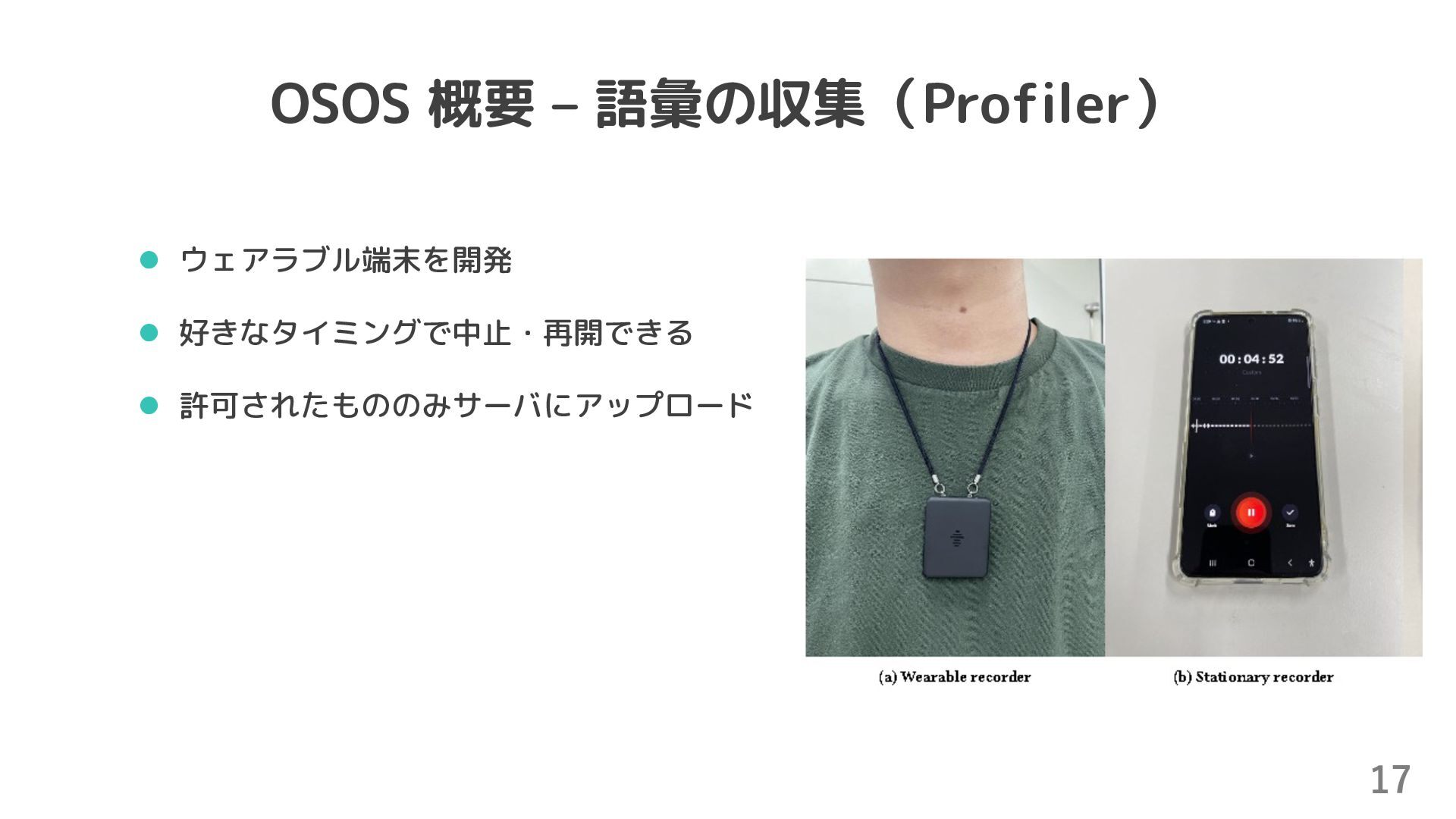 l SLPの監督下で語彙の習得が遅れている子どもへの介入も視野に l 30-million-word gapの緩和:家庭の社会経済的地位によって子どもが聞く語数が 大きく異なる(1時間あたり 2,153語 vs 616語) l 家の音声を録音することへのプライバシー懸念 l 生の音声や文字起こしは家庭内のデバイス側で処理,クラウドには抽出されたター ゲット語のみを送信する設計で軽減