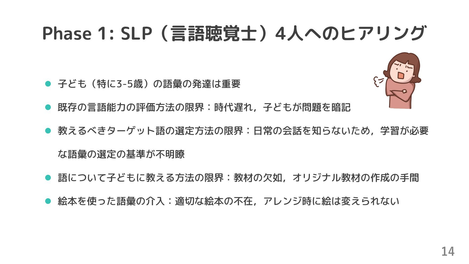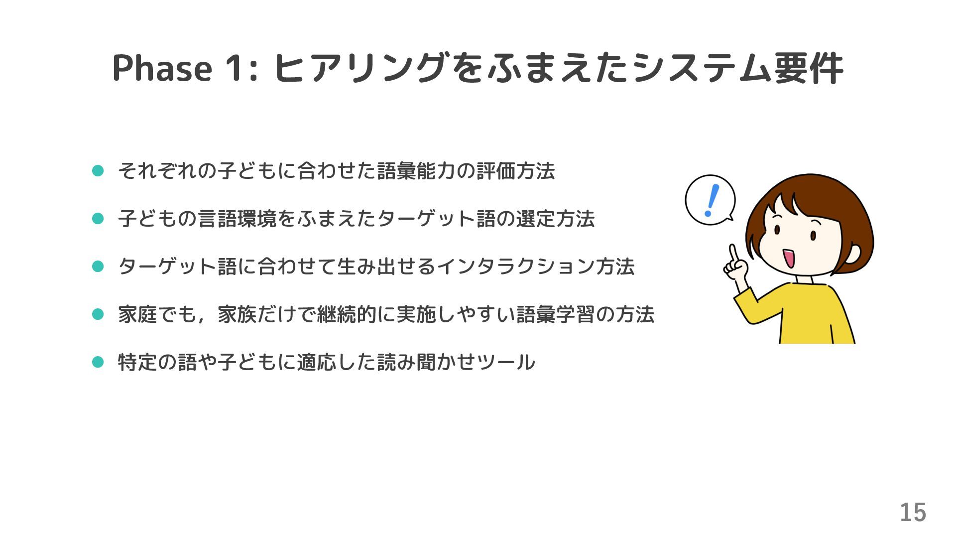 7. 14 Phase 1: SLP(言語聴覚士)4人へのヒアリング l 子ども(特に3-5歳)の語彙の発達は重要 l 既存の言語能力の評価方法の限界:時代遅れ,子どもが問題を暗記 l 教えるべきターゲット語の選定方法の限界:日常の会話を知らないため,学習が必要